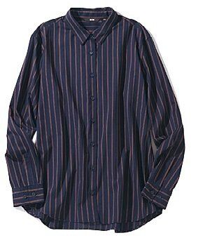 レーヨンなどの上質感のあるシャツはストレートさんの得意分野。首もとにゆとりがあり、ピンストライプ柄だとさらに着やせ効果大。/ユニクロ