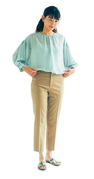 華奢な胸もとや肩まわりと比較して、下半身がどっしり見えがち。少し高めの位置でウエストをマークしたXラインのシルエットをつくると、即スタイルがよく見えます。曲線や立体感のある服もやせて見えます。
