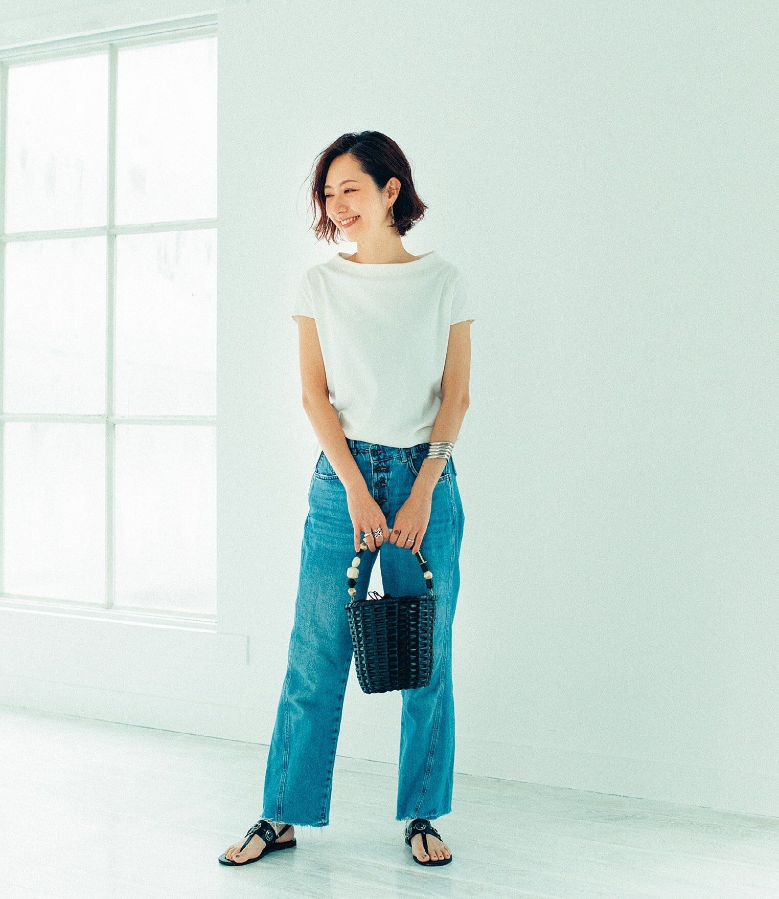 若いころはベーシックなコットンの白T+デニムでもサマになるけれど、40代からの白トップスはデザイン性が高い物をチョイス。しわになりにくい素材で、リブや切り返しのない1枚がベスト。