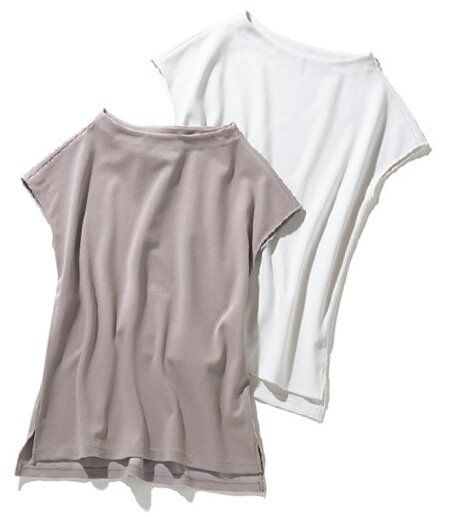 首回りにリブがないモックネック。Tシャツというよりカットソー寄りのデザインが、大人に似合います。ストレッチ性があり、着心地が快適なのも魅力ポイント。