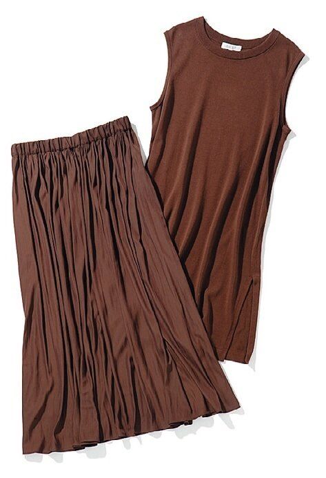 ナチュラルなニット素材のチュニックと光沢のある柔らかな素材のスカートのセット。トップスは気になる腰まわりをカバーする着丈で、スッキリ見える。