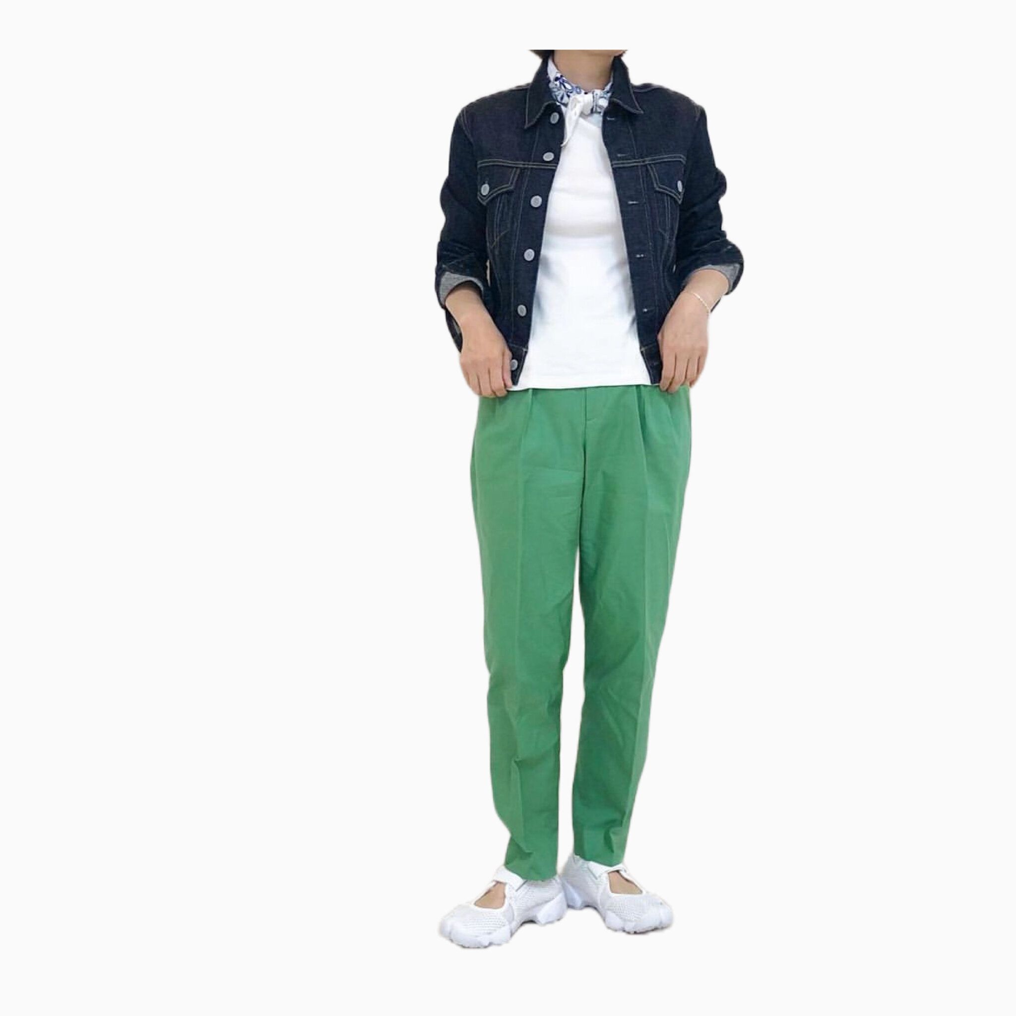✔︎デニムを合わせていたスタイリングをキレイ色パンツにチェンジして、脱カジュアル。