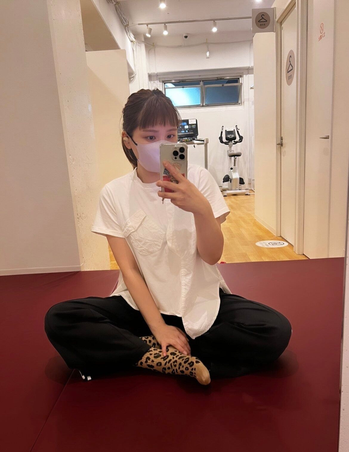 デザインTシャツとテーパードパンツ。ウエストゴムのテーパードパンツならジム着としてもいけちゃう。レオパード柄のソックスをアクセントに。