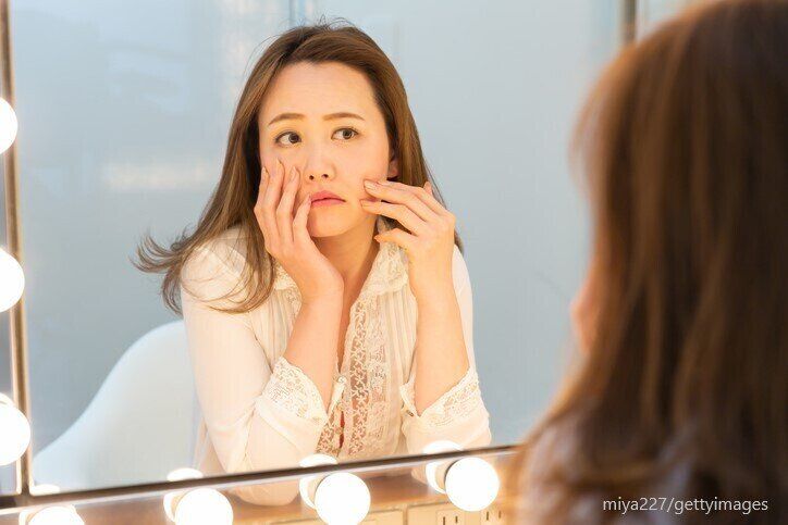 私の場合、今までのようにパープルで肌の透明感を出そうとすると少し顔色が悪く見えてしまうようになってしまったようです。若い頃はパープルでもよかったのですが、最近はしみや、もやっと現れ始めた肝斑の影響で肌の色むらが目立つうえに、目の下や口元の小じわやたるみによって顔にできる影も気になってきました。