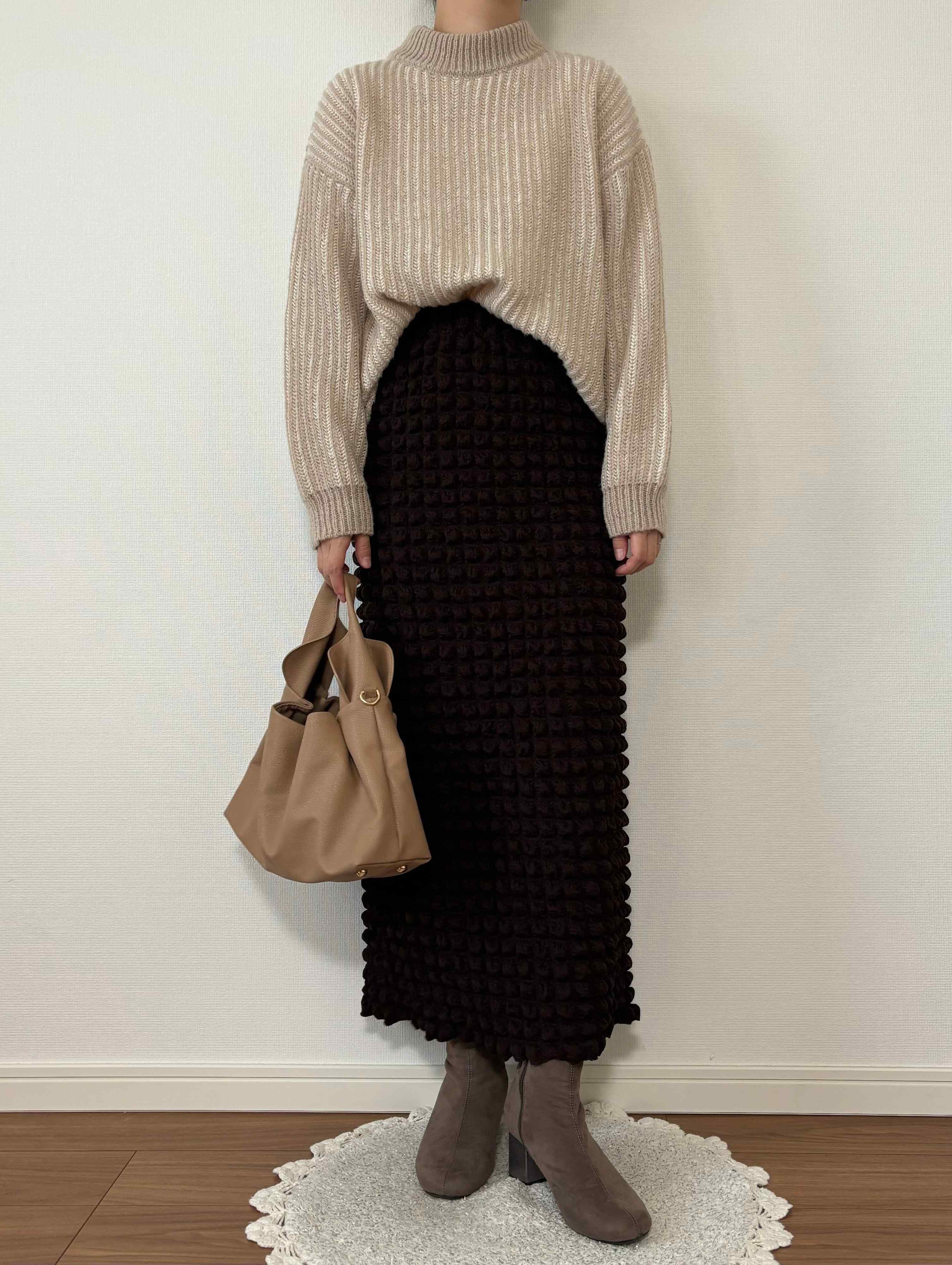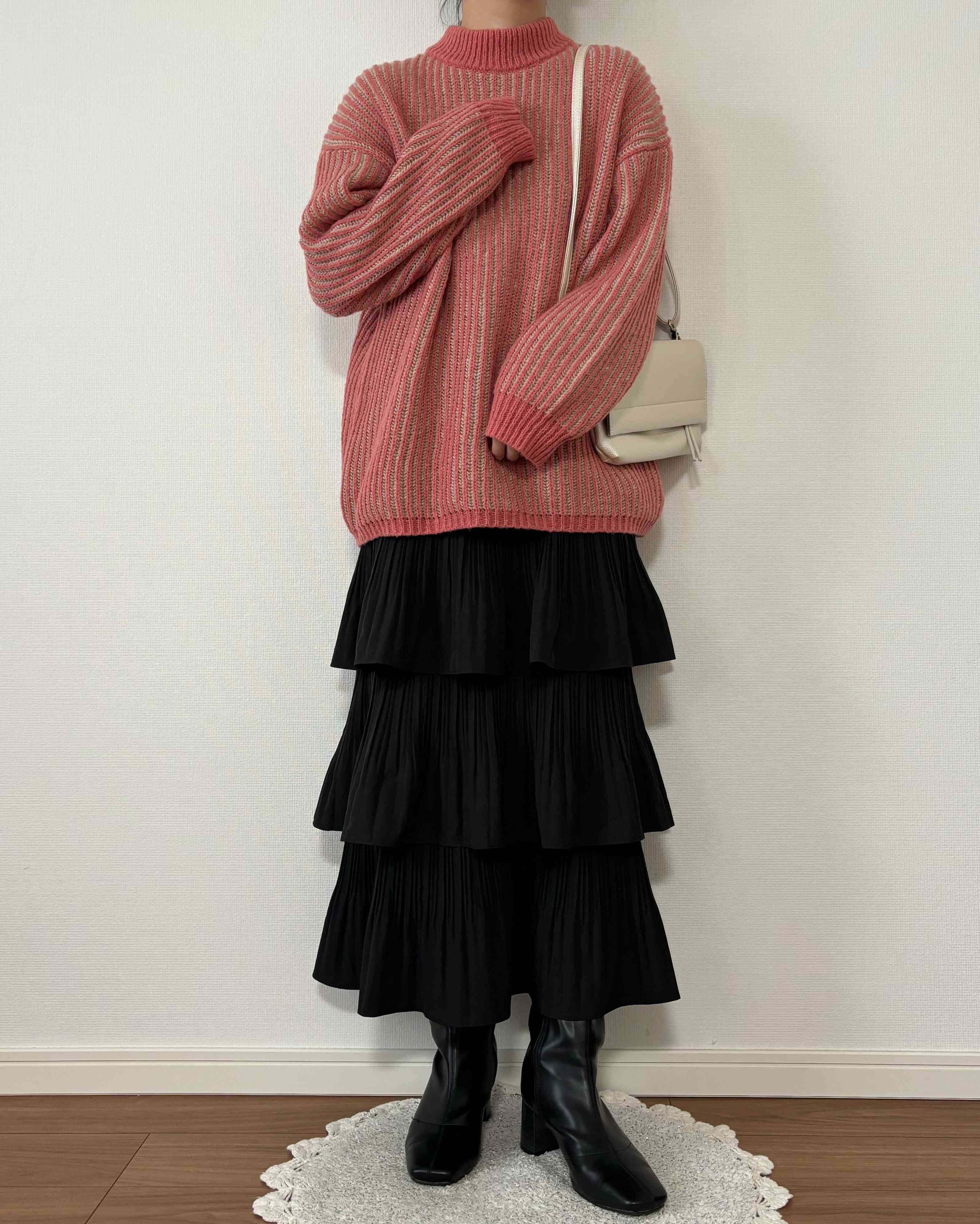 モノトーンコーデの差し色にも最適で、上からコートを羽織っても存在感を発揮する1枚です。