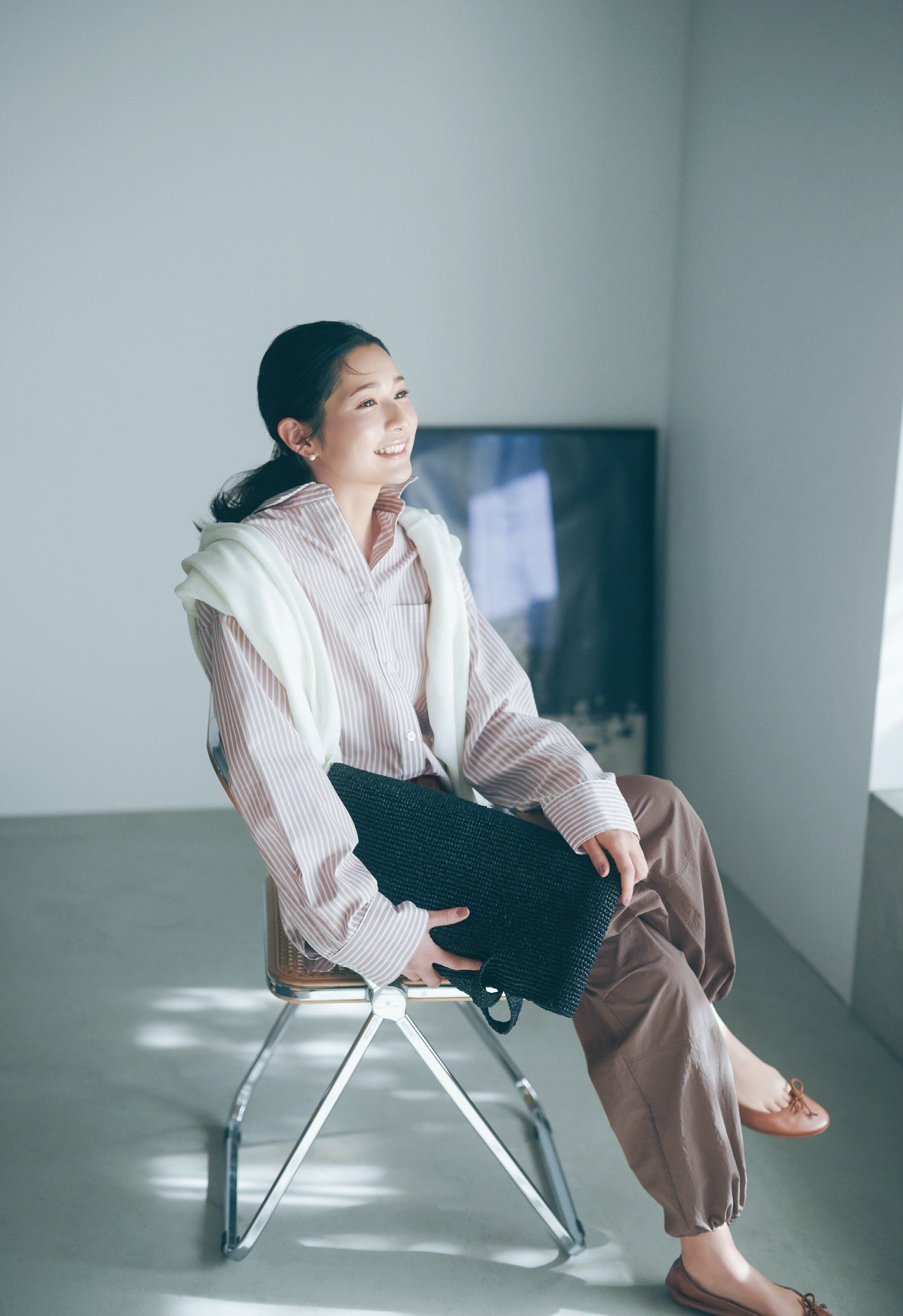 サンキュ!アンバサダー 瑛未さん ストライプオーバーサイズシャツ¥2,290、テックパラシュートプルオンパンツ¥2,990、肩がけしたウォッシャブルクロップドカーデ¥2,990、メタルヘアカフ2P ¥590 /ジーユー ピアス¥3,150、ネックレス¥2,970 /アビステ バッグ¥18,700 /カマリヤ(デミルクス ビームス 新宿TEL 03・5339・9070) バレエシューズ¥14,300 /リサコンテ(ビーミング ライフストアby ビームス ららぽーとTOKYO-BAY店)