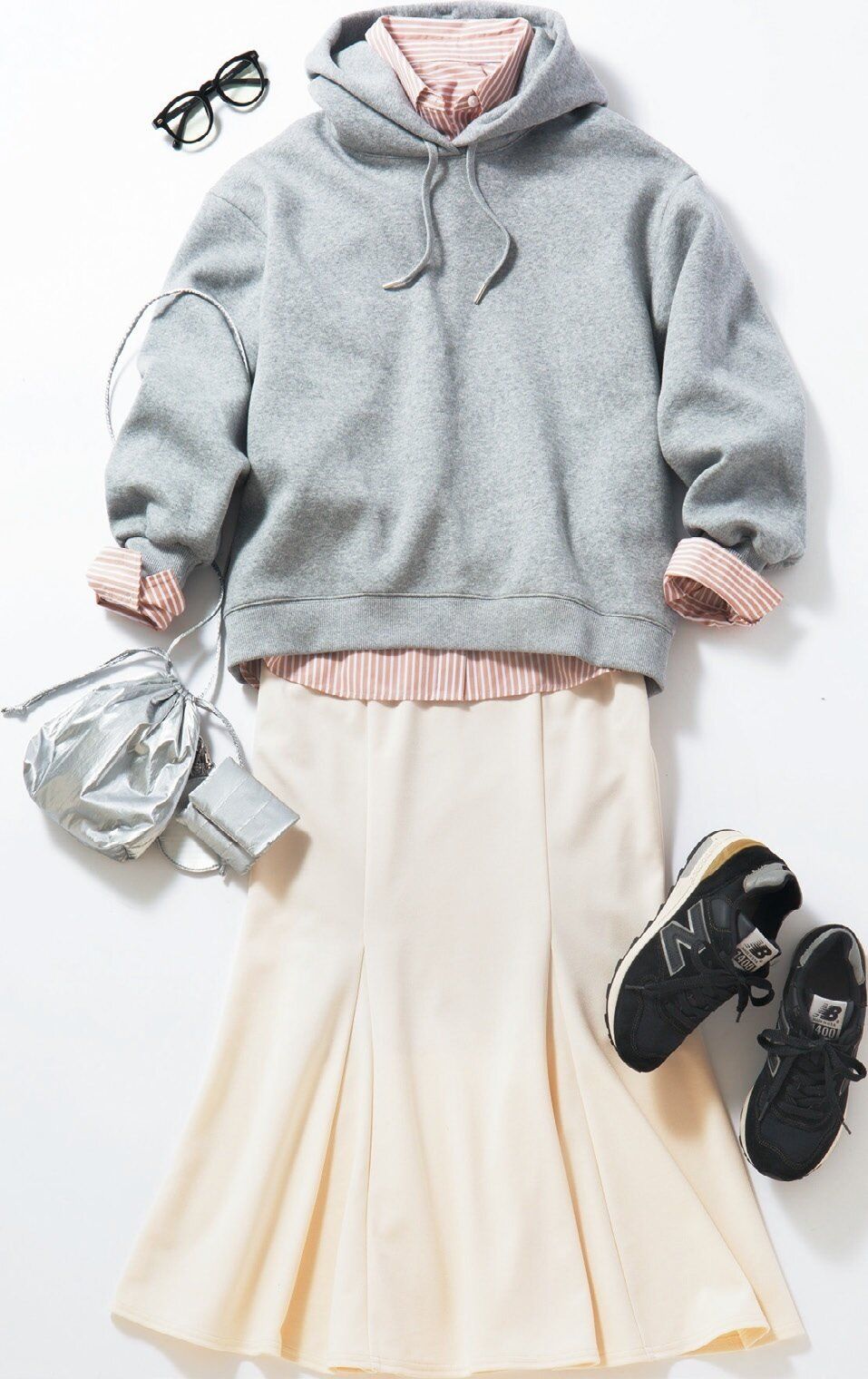 ヘビーウェイトスウェットオーバーサイズパーカ¥2,290、カットソーマーメイドロングスカート¥1,990※一部店舗のみ販売、UVカットボストングラス¥990、ナイロン3セットショルダーポーチ¥1,990※店舗により売り切れの可能性があります/ジーユー スニーカー¥16,500 /原宿シカゴ 神宮前店(TEL 03・5414・5107)