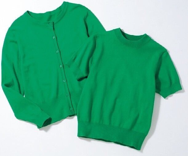 〈グリーンのツインニット〉誰もが今年っぽくなれる推しカラーニット。組み合わせても単品でも使えるツインニットが3000円台という破格!着まわし力が高く、鮮やかなグリーンは着映えしまくり。