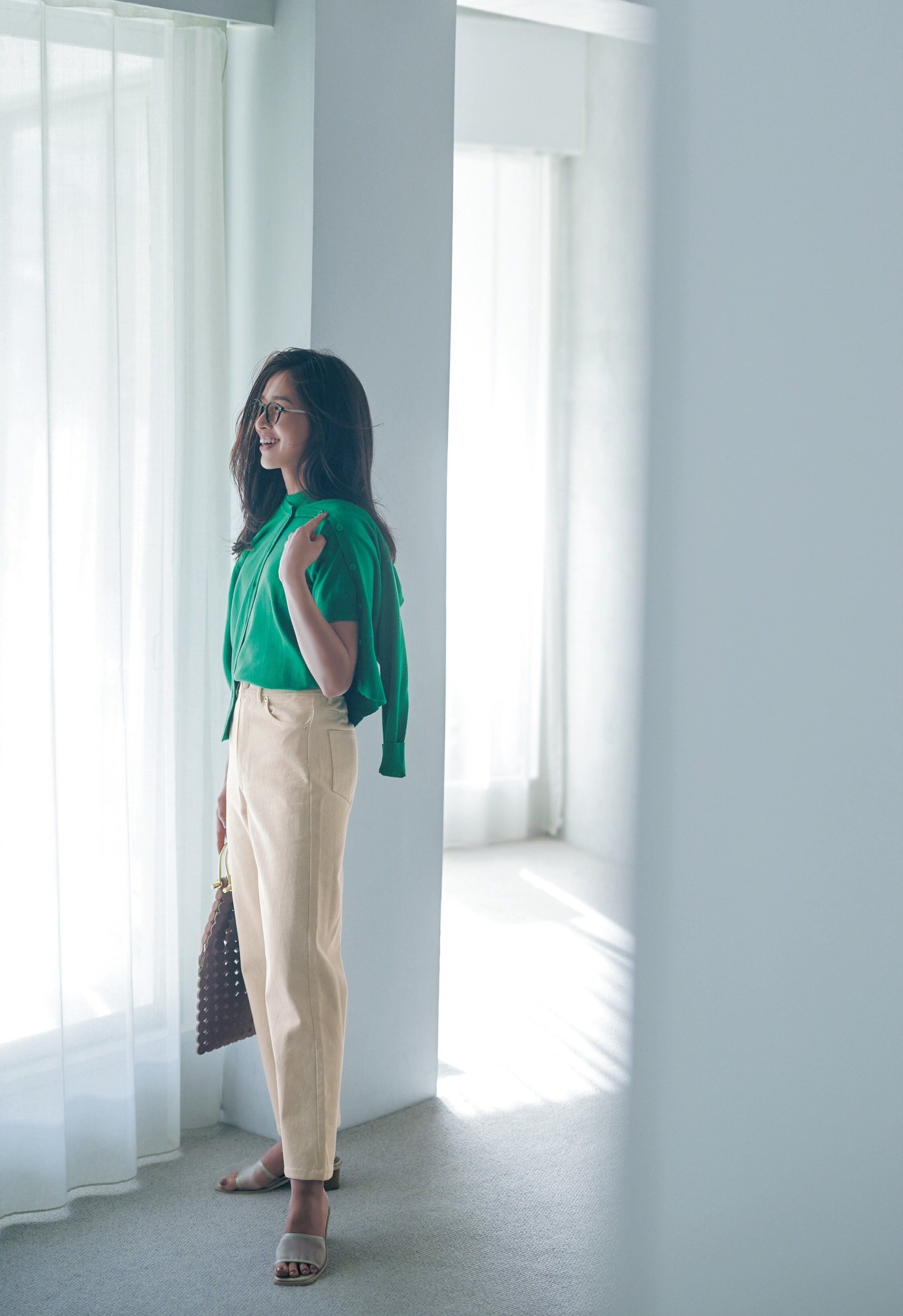 サンキュ!アンバサダー 登淳美さん 半袖ニット・カーディガン[セット] ¥3,990、カラーツイルスリムワイドパンツ¥2,750、ミュールサンダル¥2,530 /神戸レタス メガネ¥12,000/オンデーズ(TEL 0120・900・298) バッグ¥35,200 /メアリ オル ターナ