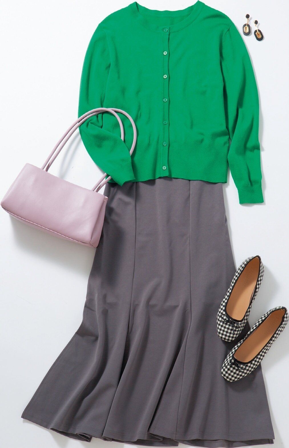 発色のいいグリーンのニットが主役の引き算コーデ。盛りすぎない組み合わせで若々しく。半袖ニット1枚にすれば夏までOKです。