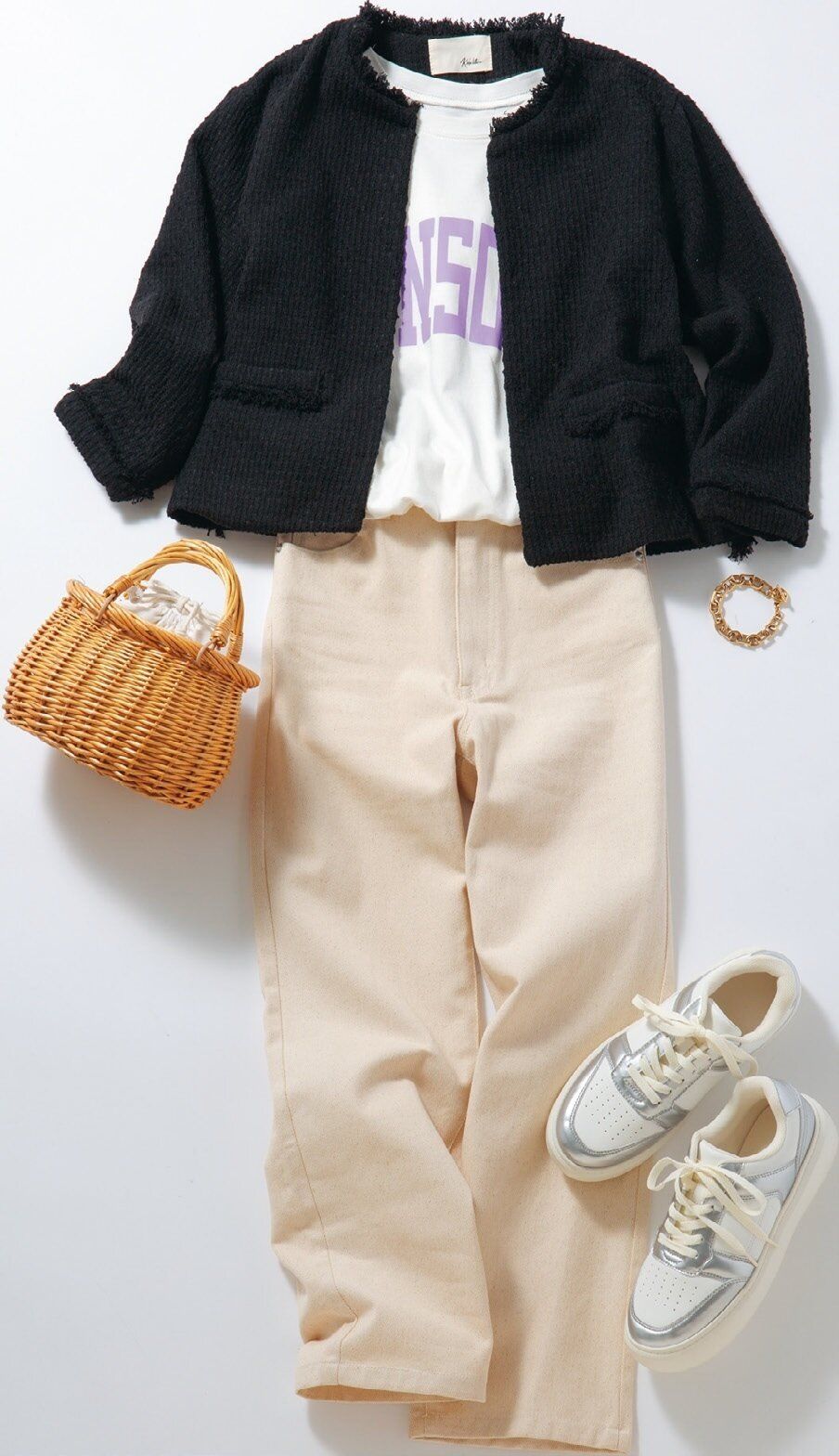 ツイードジャケット¥5,480、プリント半袖Tシャツ¥1,690、ラタン素材サークルバッグ¥2,790 /神戸レタス ブレスレット¥5,250 /アビステ スニーカー¥2,990 /ジーユー