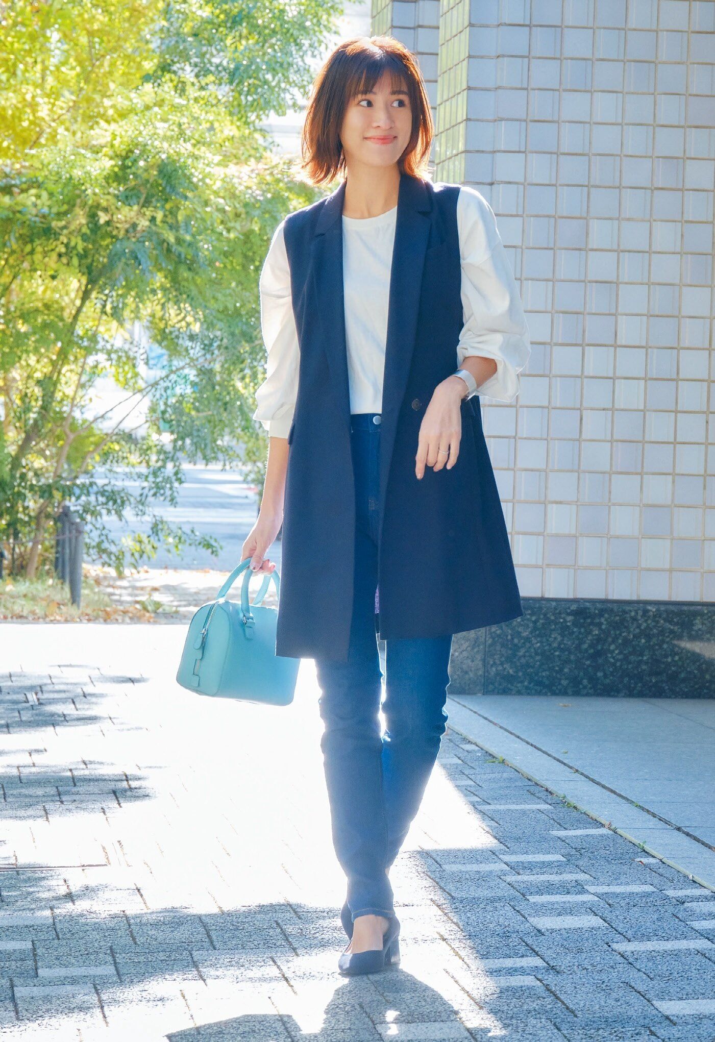 ミドル丈ジレでIラインを意識してシャープに!