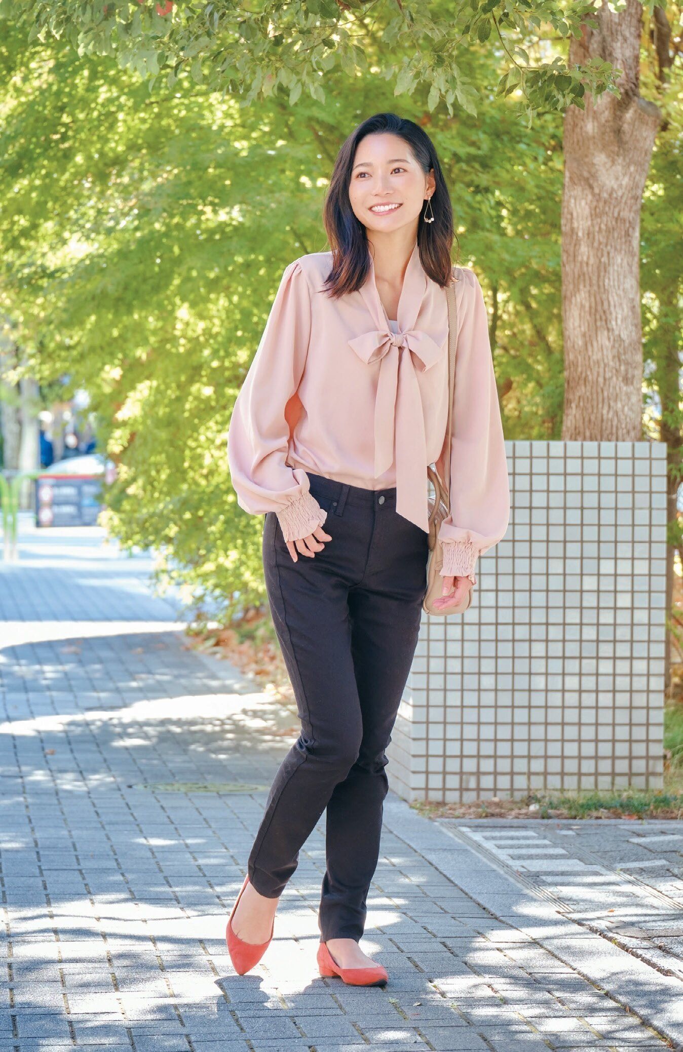足首に抜け感を出して脚長にボウタイブラウスで華やぎをプラス