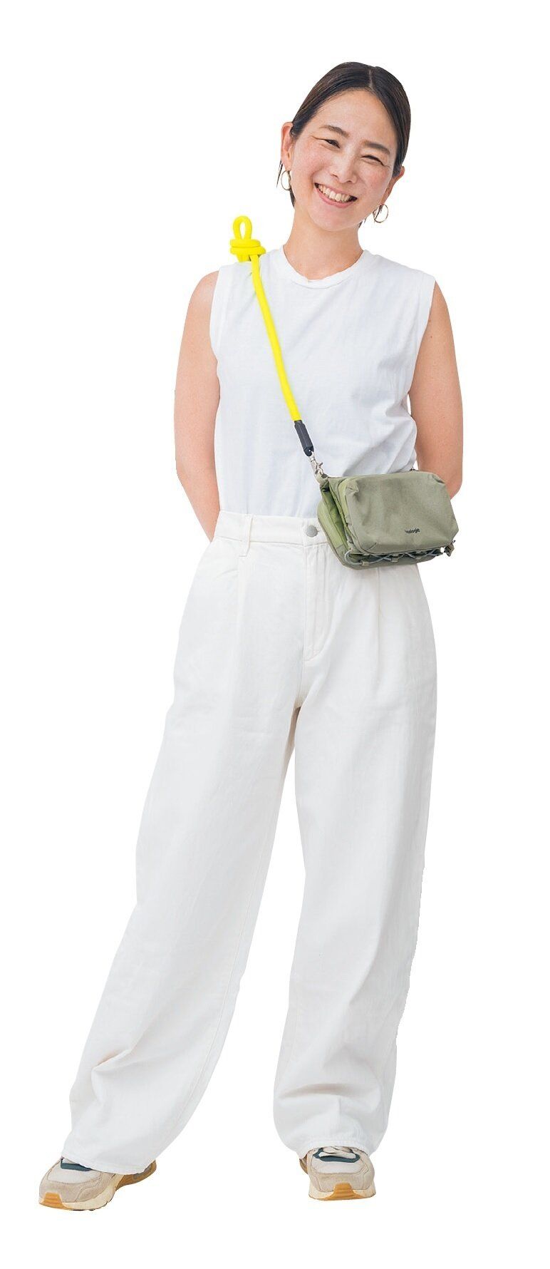 白上下をのっぺり見せない秘訣は利かせ色。涼子さんがよく合わせるのは蛍光イエロー、赤、ブルー、グレー、黒、ゴールド、シルバー。