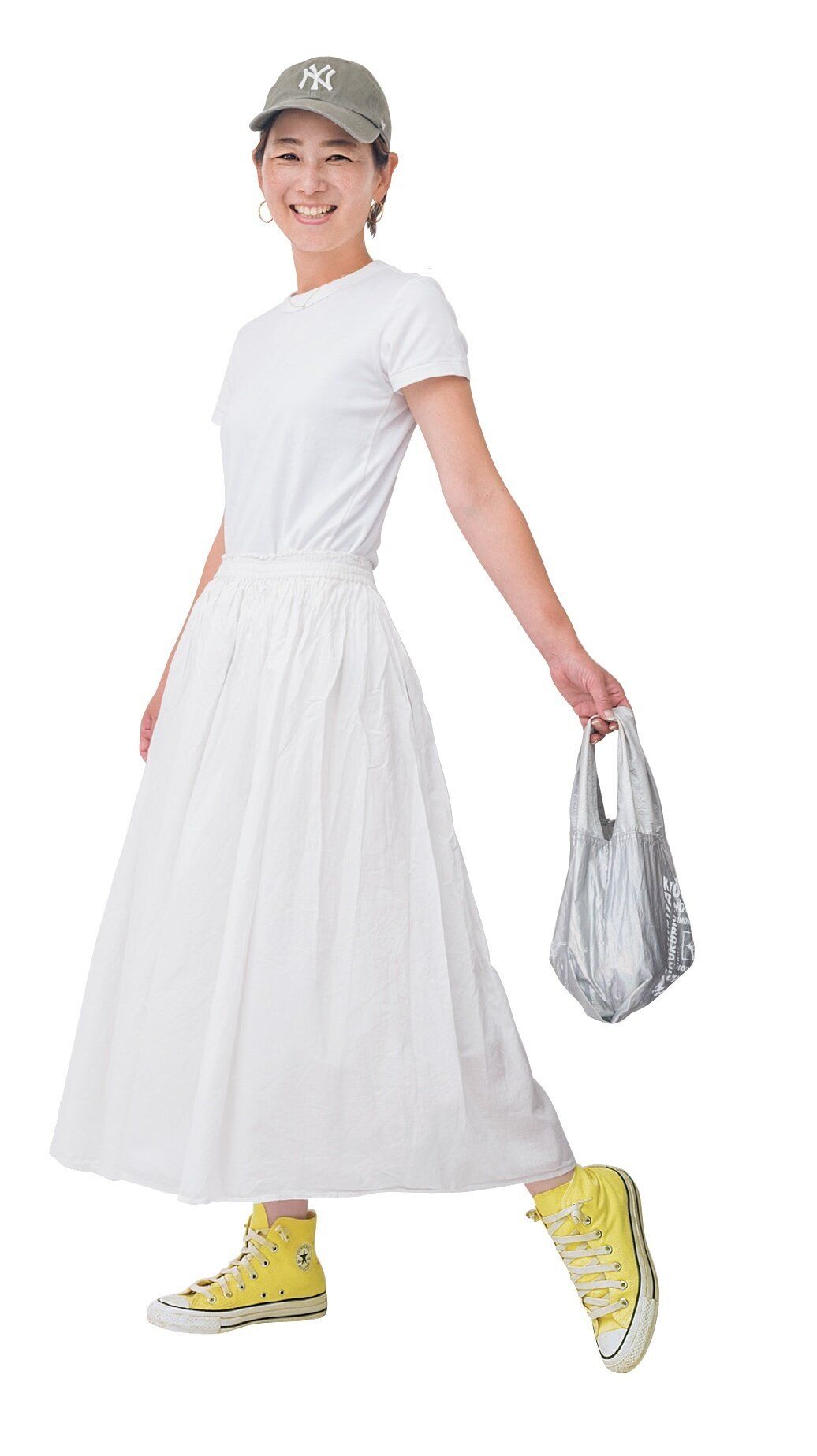 ウエストはラクだけどおしゃれしてる感。蛍光イエローのコンバースとシルバーのバッグを差して。