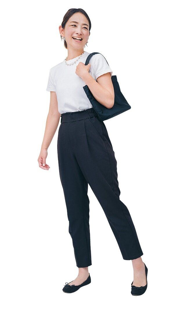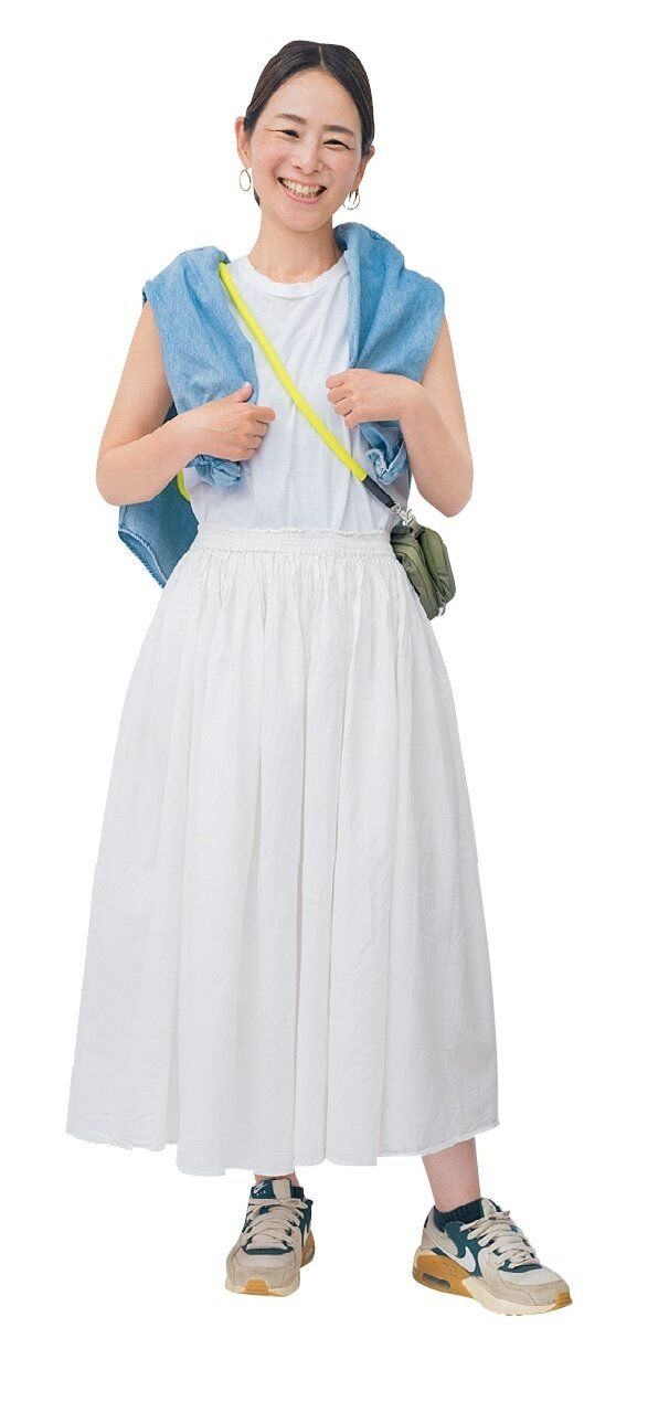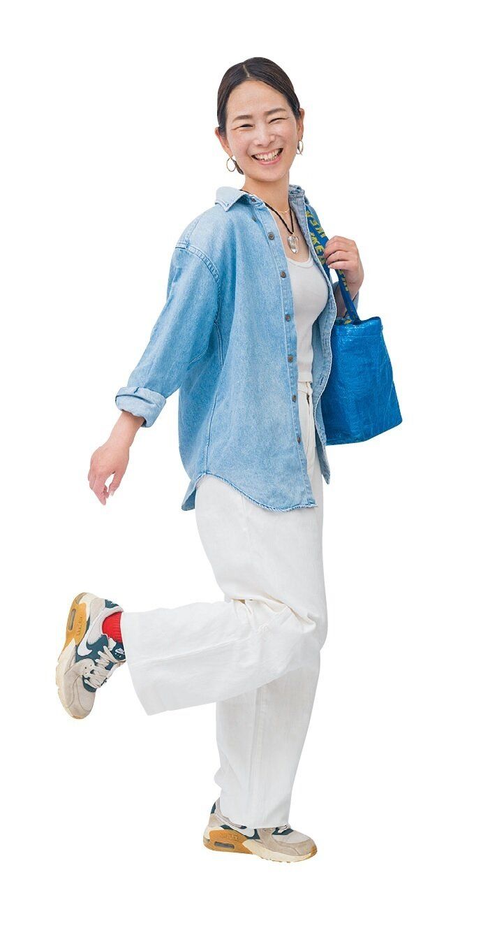 子ども5人の母ちゃんとして毎日バタバタの涼子さんの制服は「白の上下」。「毎朝おべんとうも作っていて、朝5時半起きでも時間が足りない。私の服は上も下も白に固定しちゃえば朝、組み合わせに悩まなくて済むと気付き、ここ5年くらい白コーデで生きてます。白は漂白できるからシミは気にならないし、白がレフ板みたいになって顔色が明るく元気に見えるのも40代の私には最高です」。