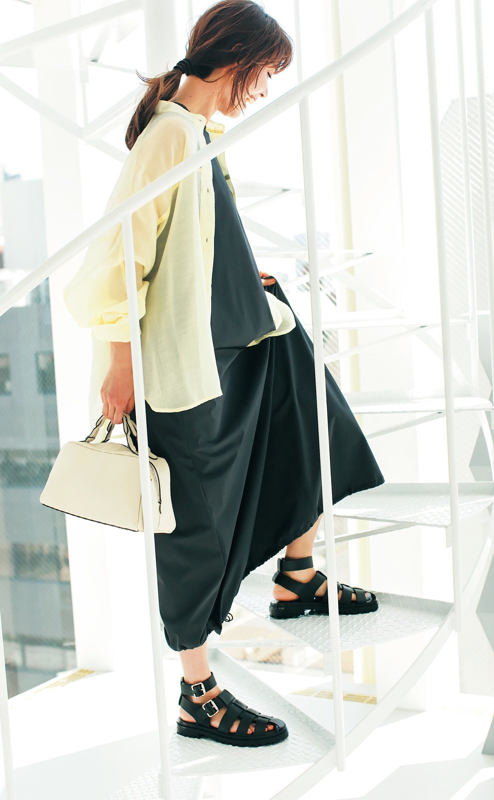 サンダル(下記参照)ブラウス¥14,300 /ルージュ・ヴィフアンナ(ルージュ・ヴィフ ラクレルミネ新宿店TEL03・5908・2340) ワンピース¥11,000 /アバハウスマヴィ、バッグ[ショルダーストラップ付]¥27,500 /ロウェルシングス(アバハウスインターナショナルオンラインストア)ピアス¥7,700 /アビステ