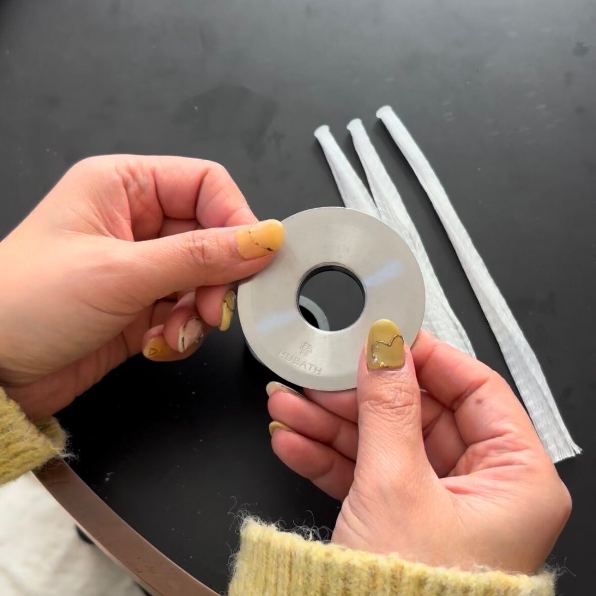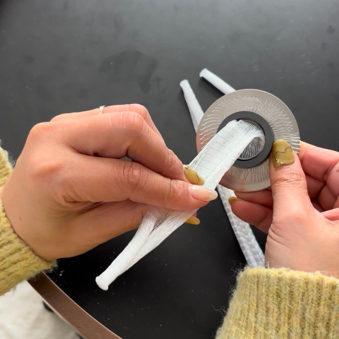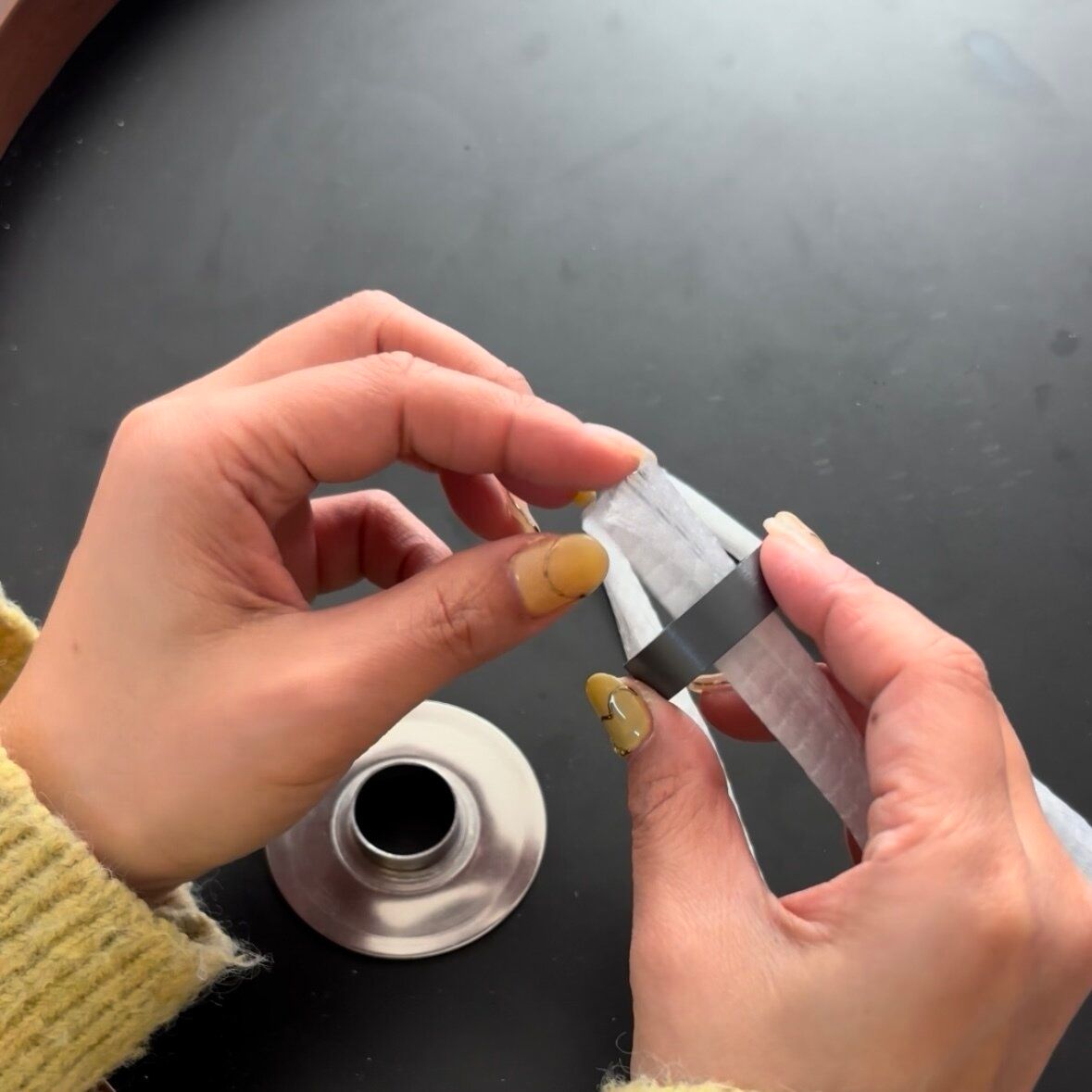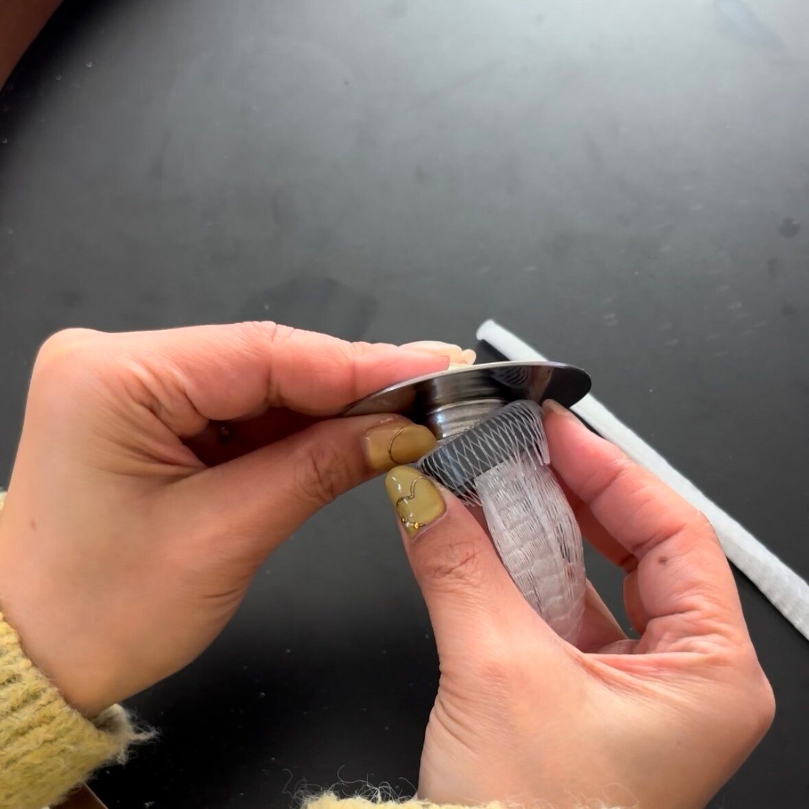 マグネットの中央に排水口ネットの先端を入れます。