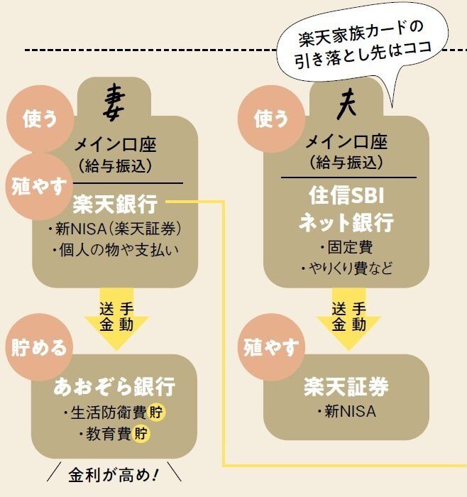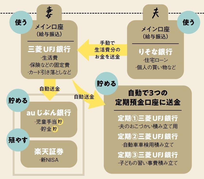 最小限の口座でお金の流れを明確に。「夫の収入で家計を回し、妻の収入は貯蓄と投資に。いくら投資に回せるかもわかりやすい」。