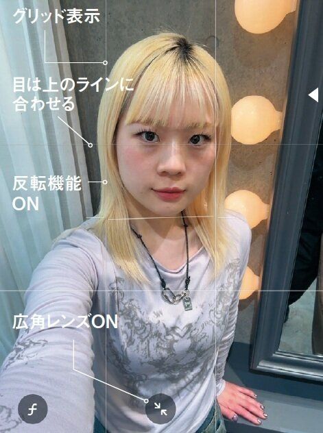インカメラで自撮りするときはまずiPhoneのカメラ設定でグリッドと前面カメラの反転機能をON。「レンズを広角にし、目をグリッドの上のラインに合わせると顔が小さく見えますよ!」。