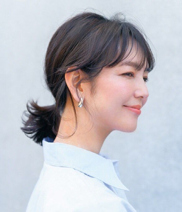 「手ぐしでざっくりまとめて低めの位置で結び、束ねた毛先を軽く巻いて散らすとこなれ感がアップ!さらに、耳前・耳後ろの毛束を少し引き出すと、疲れて見えない後れ毛になるんです」。