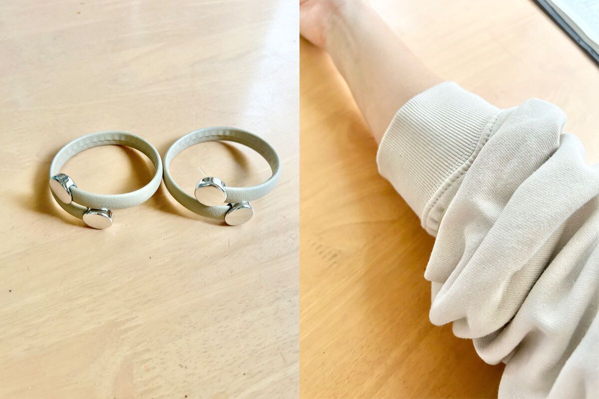 私の場合、オーバーサイズスウェットはお尻がすっぽり隠れるH&Mのメンズのものを愛用。オーバーサイズのメンズだと袖も長くゆるくなって腕まくりしたいときに困るのですが、ダイソーのアームバンドを使えば問題なし。