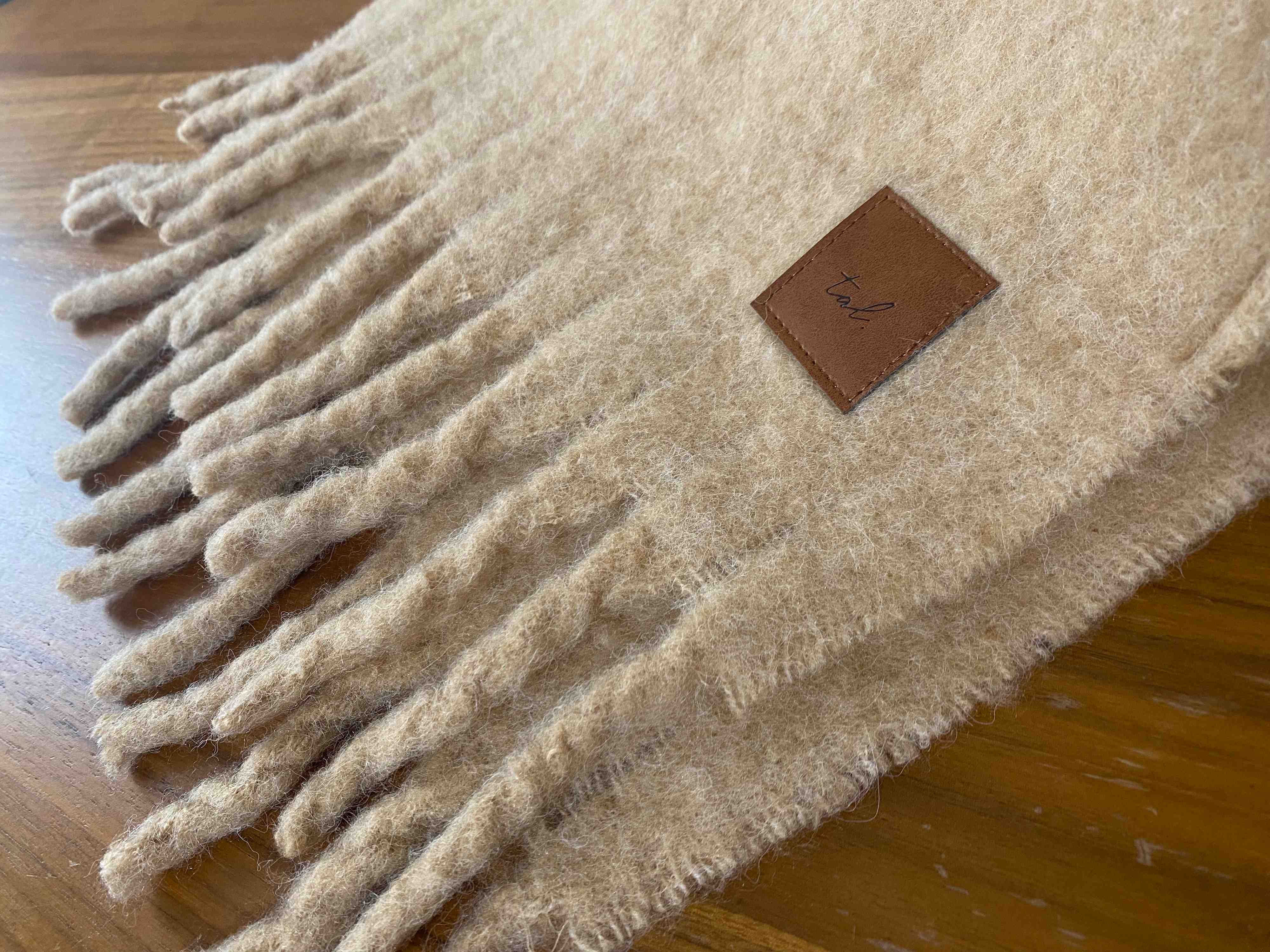 太めのフリンジと、ワンポイントで合皮素材のタグが縫い付けられています。
