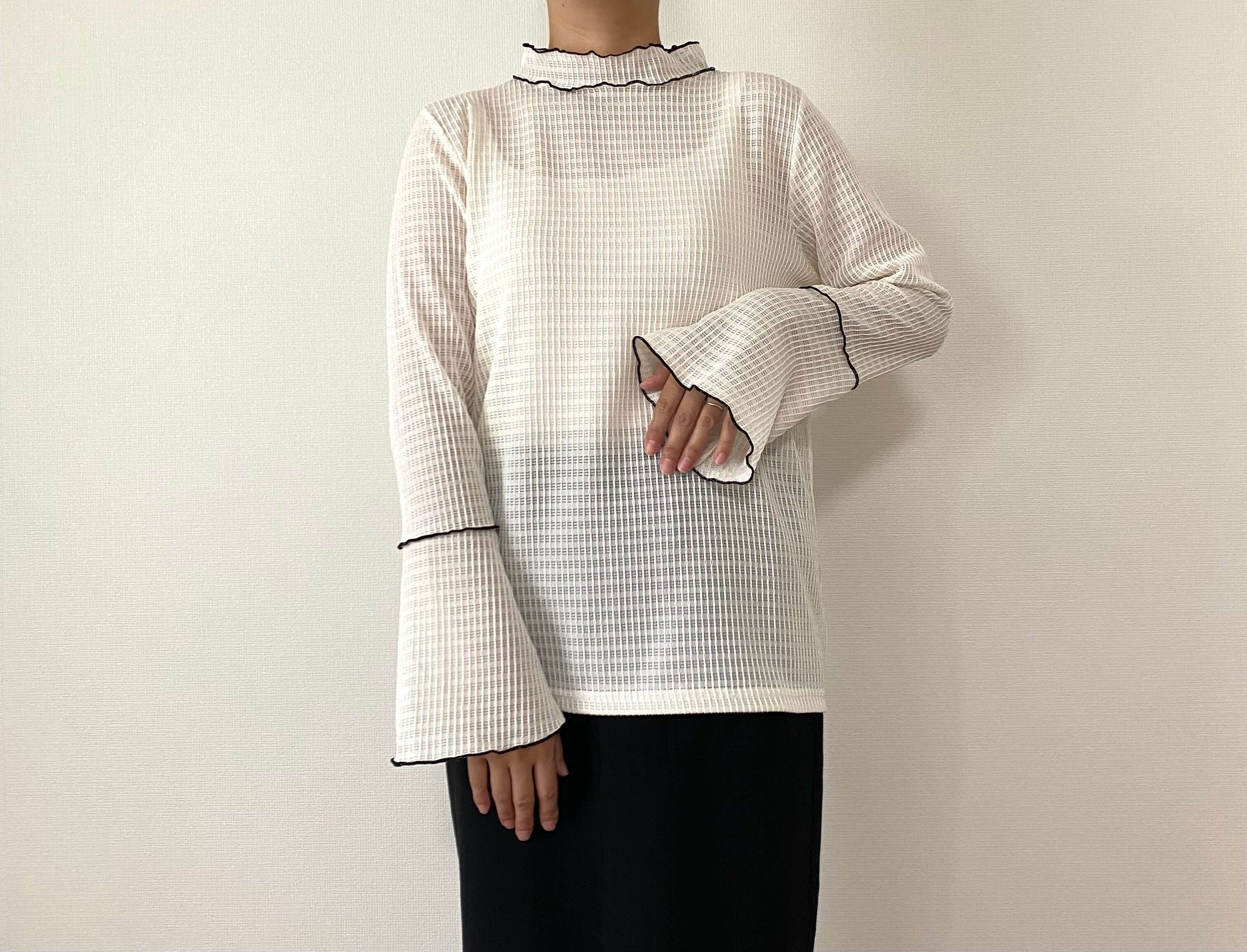 首元と袖に施されたメローデザインはバイカラーなので存在感があり、袖もトレンドのフレア袖で1枚で着ても着映えする優秀アイテムです。