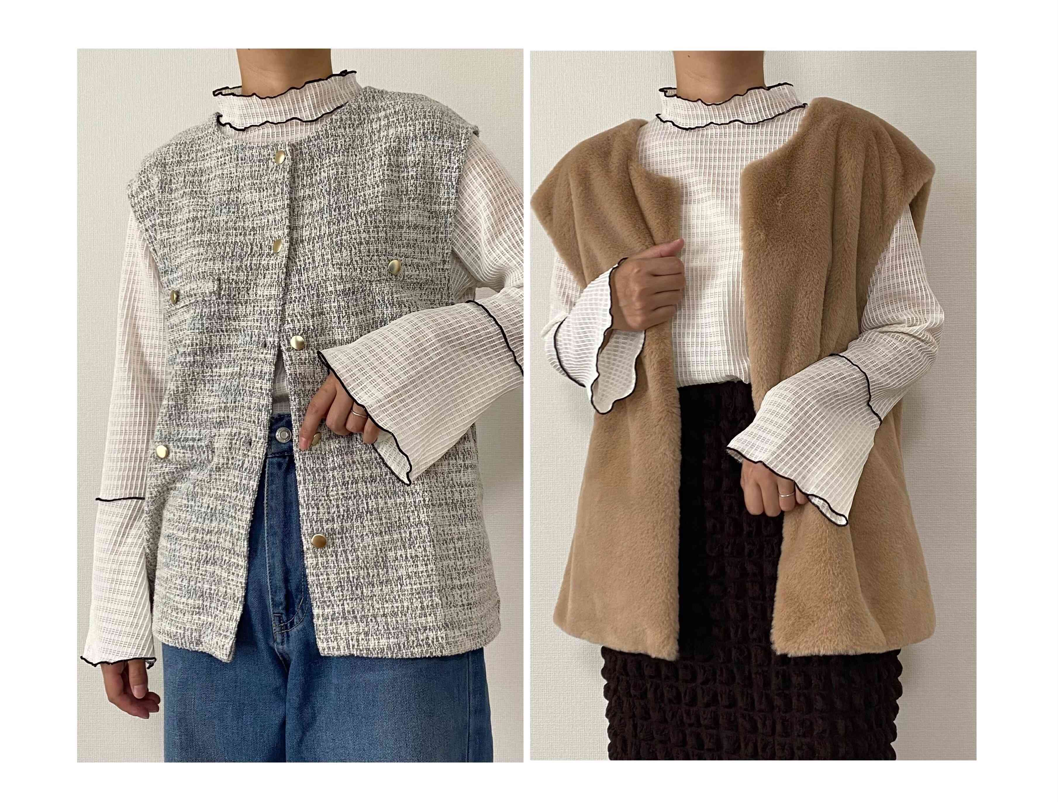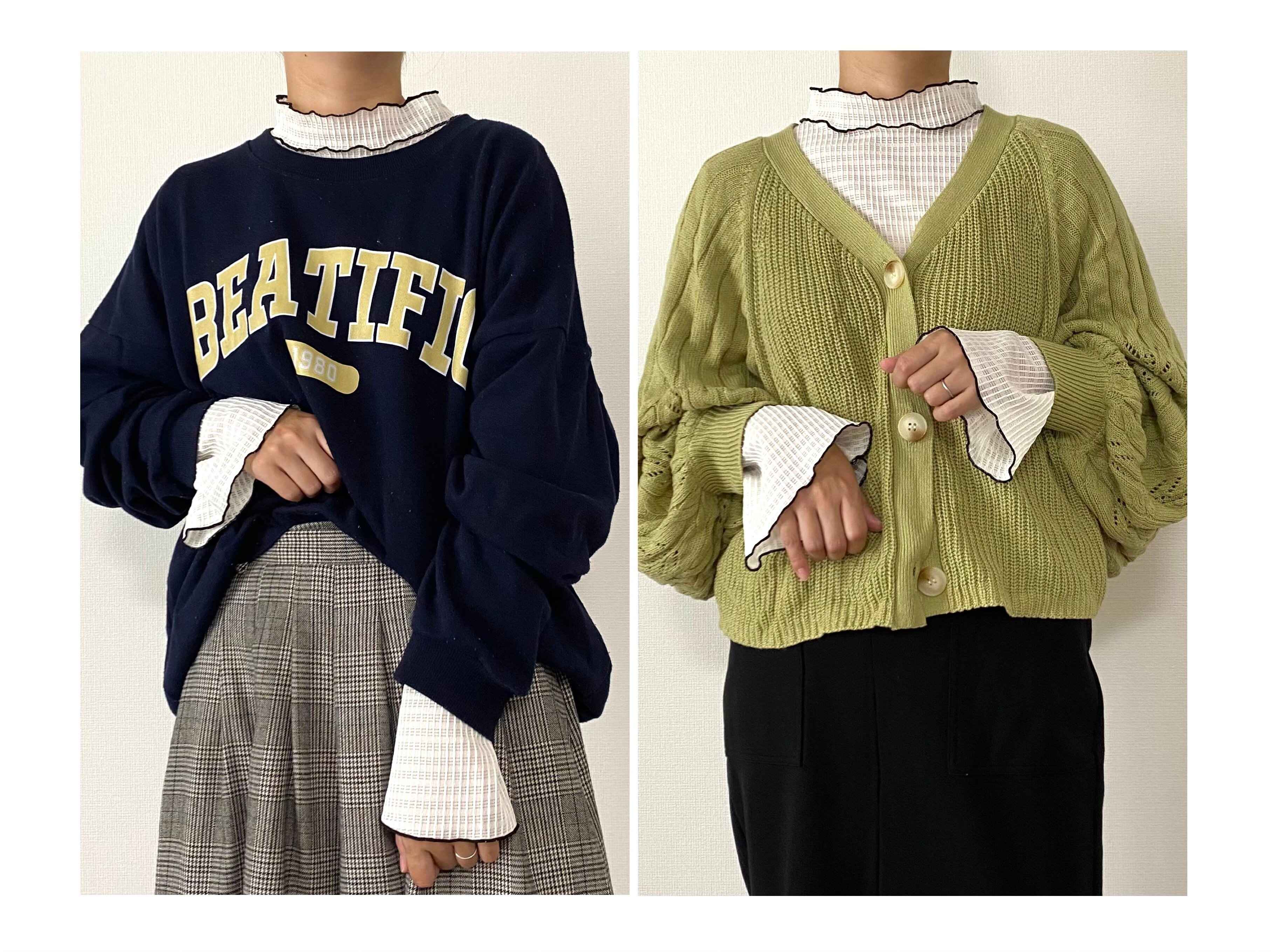 首元と袖にデザインがあるとベストとレイヤードしたときもメローがポイントになってかわいさ抜群!