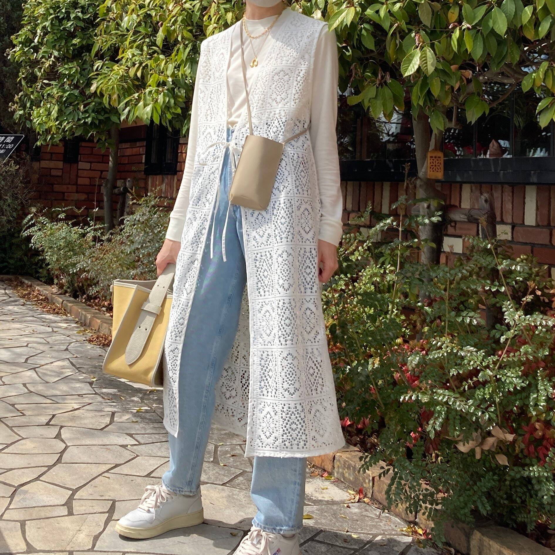 今年、よく見かけるシースルートップス。こちらは、冬に販売されていたユニクロのインナーなのですがカットソー感覚で愛用しています。透け感はほとんどなくても、1枚で着るとスーパーのレジ待ちなど、まわりの目が気になってしまうことも…。そんなときは、ジレがイチオシ。サッと羽織っておくと透け感をうまくカモフラージュできます。さらに白トップスに白のジレならテクニックいらずでまとまって見えて◎。ほかにもジャンパースカートなど上半身が隠れるアイテムとシアーなトップスをいっしょに着るのもオススメです。