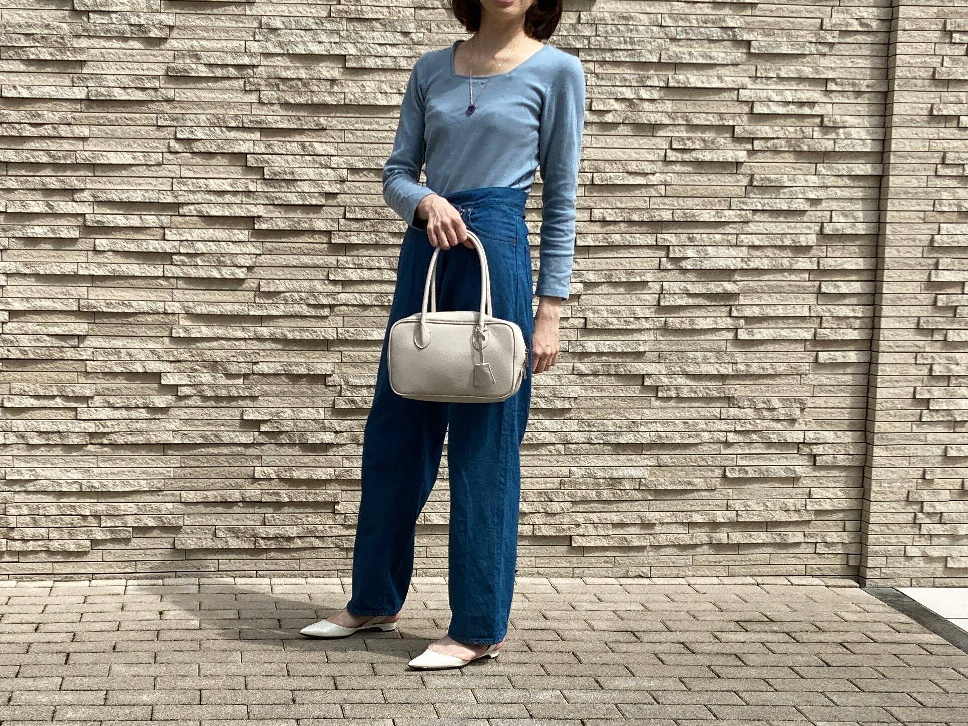 ワントーンコーデを考えるときは、何の色でもトップスの色を薄くした方が全身バランスがまとまりやすく感じます。スッキリと見せてくれる白小物は、あると便利なアイテム。バックストラップシューズできれいめにまとめてみました。