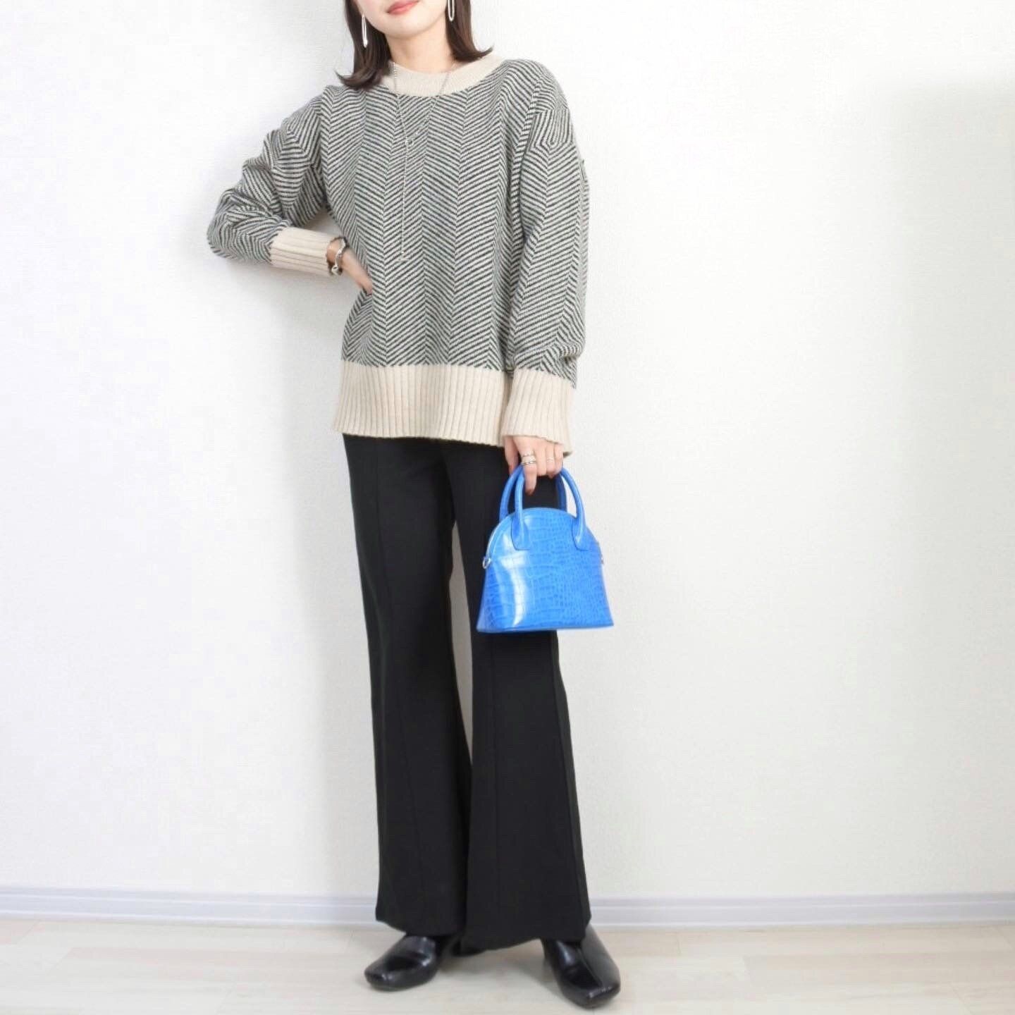 ブラックのフレアパンツと合わせて一気にモードっぽいスタイリングに。ヘリンボーン柄ニットをかっこよく着こなしたい方におすすめなスタイリングです。