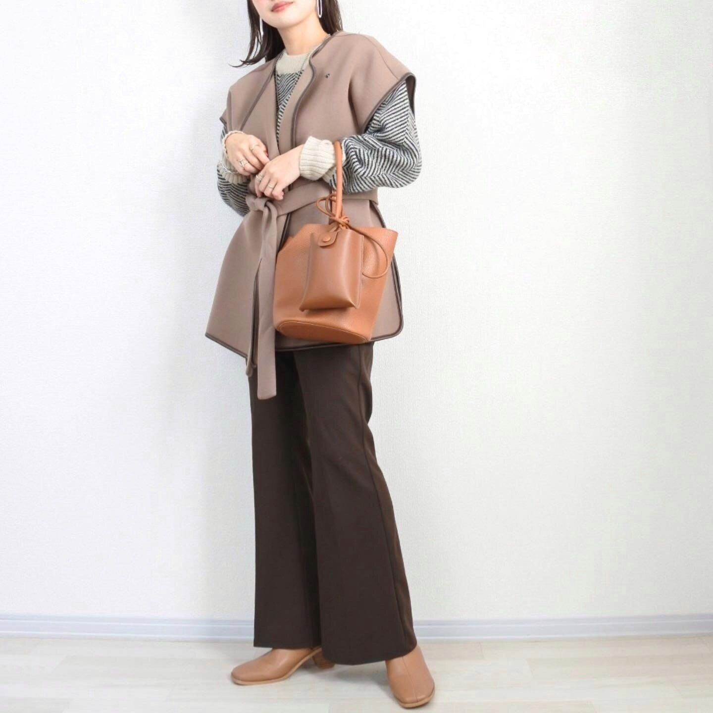 ベストの色味に合わせてボトムスや小物をブラウン系でまとめるのも今風なスタイリングになりおすすめ。