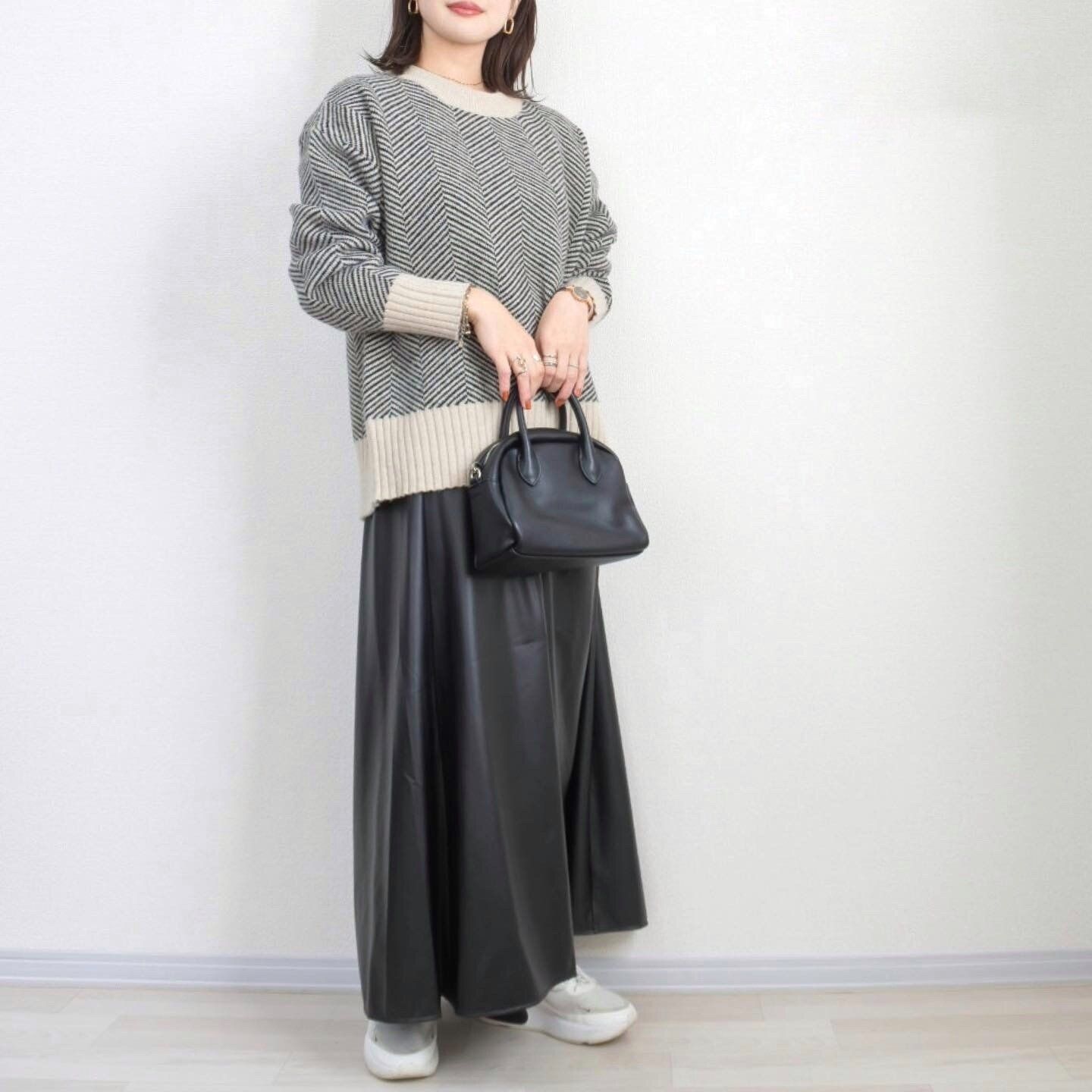 秋から冬にかけて合わせたいアイテムといえばレザーアイテム。ヘリンボーン柄と同じブラックのレザースカートを合わせて大人なモノトーンコーデに。