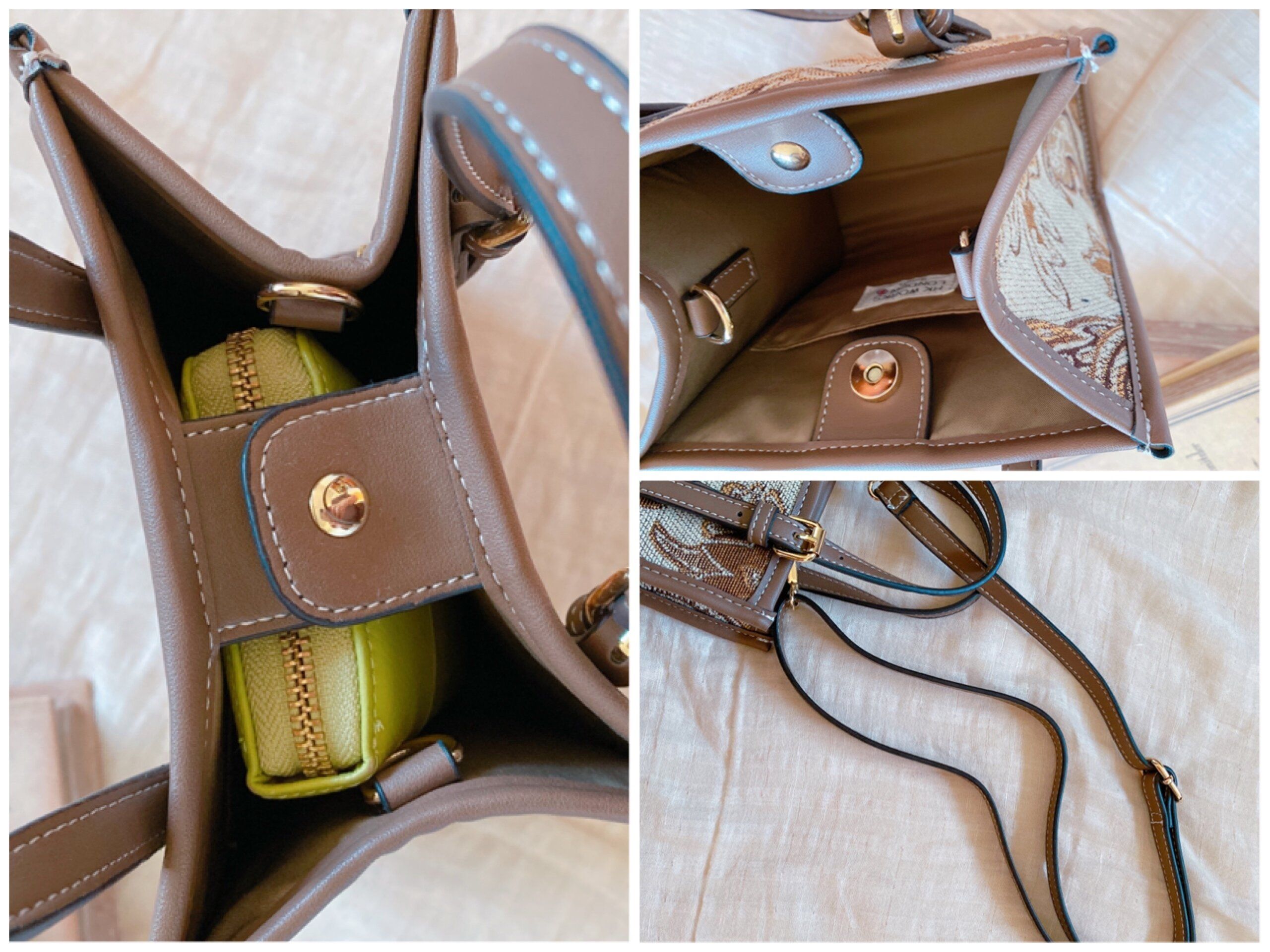 また、ベージュトーンのバッグなので落ち着いた印象にもなりますね。