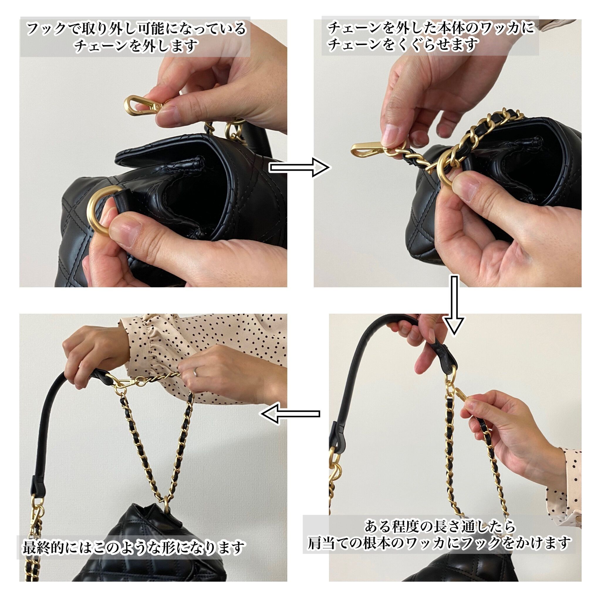 こちらのバッグのチェーンは取り外し可能!さらにこのようにチェーンを二重にすることで長さを短く調整することも可能です。