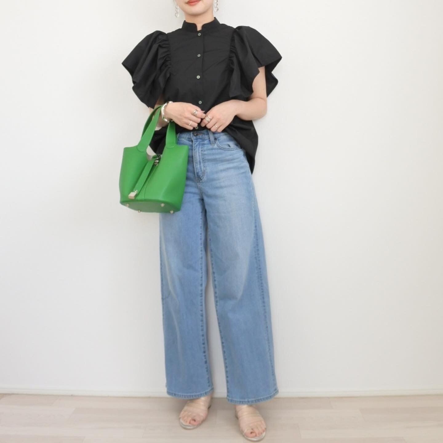 肩フリルがふんわり広がっているのでボトムスはタイトめなものと合わせると全体が締まります。