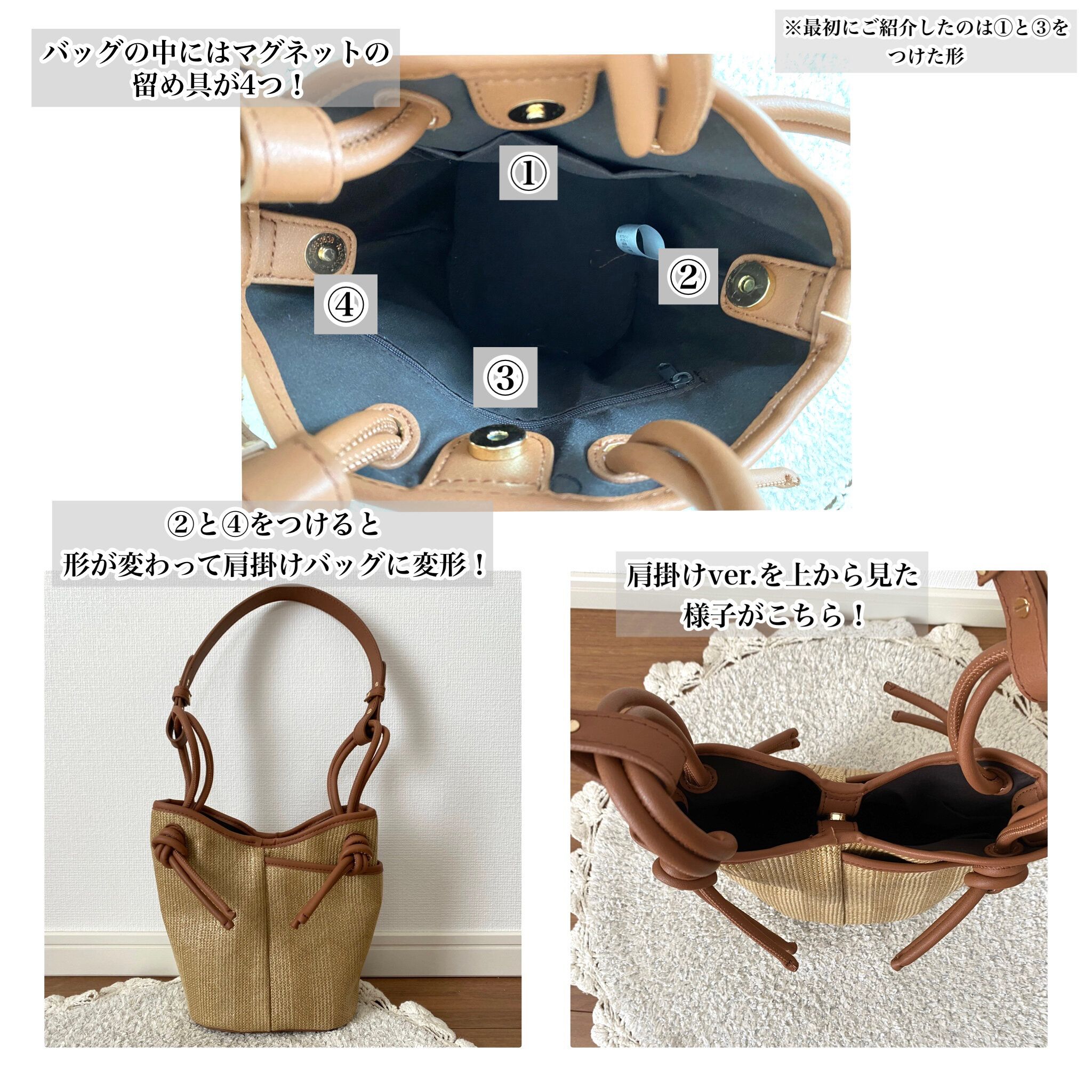 持ち手の丸紐がキュッと結ばれたデザインがトレンド感のあるカゴ風バッグです。