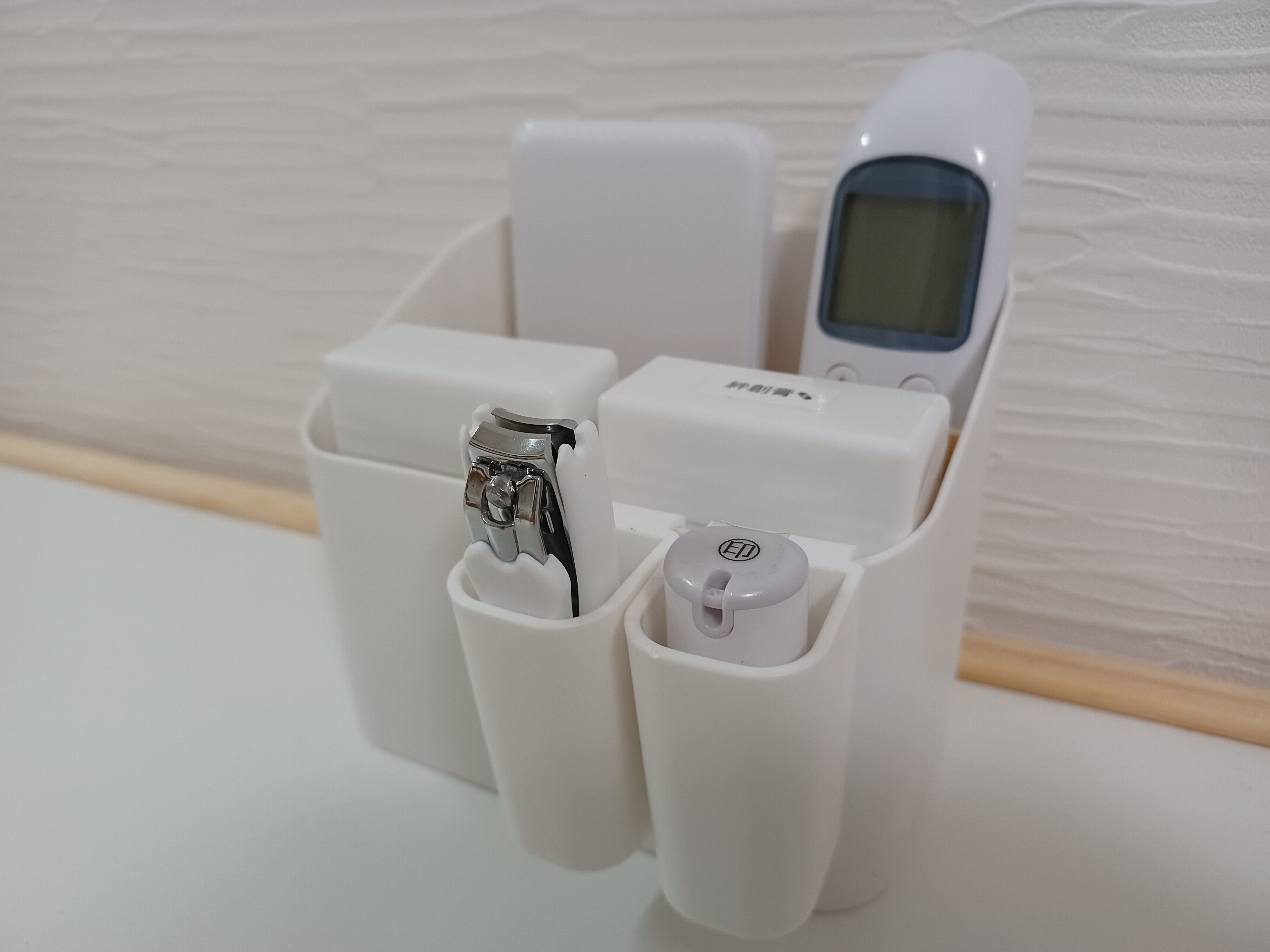 この中には子ども達が毎日使う体温計やハンコなどすぐ出したいものを。定位置を作ることで、分かりやすいですし直し忘れもしなくなりますよ。
