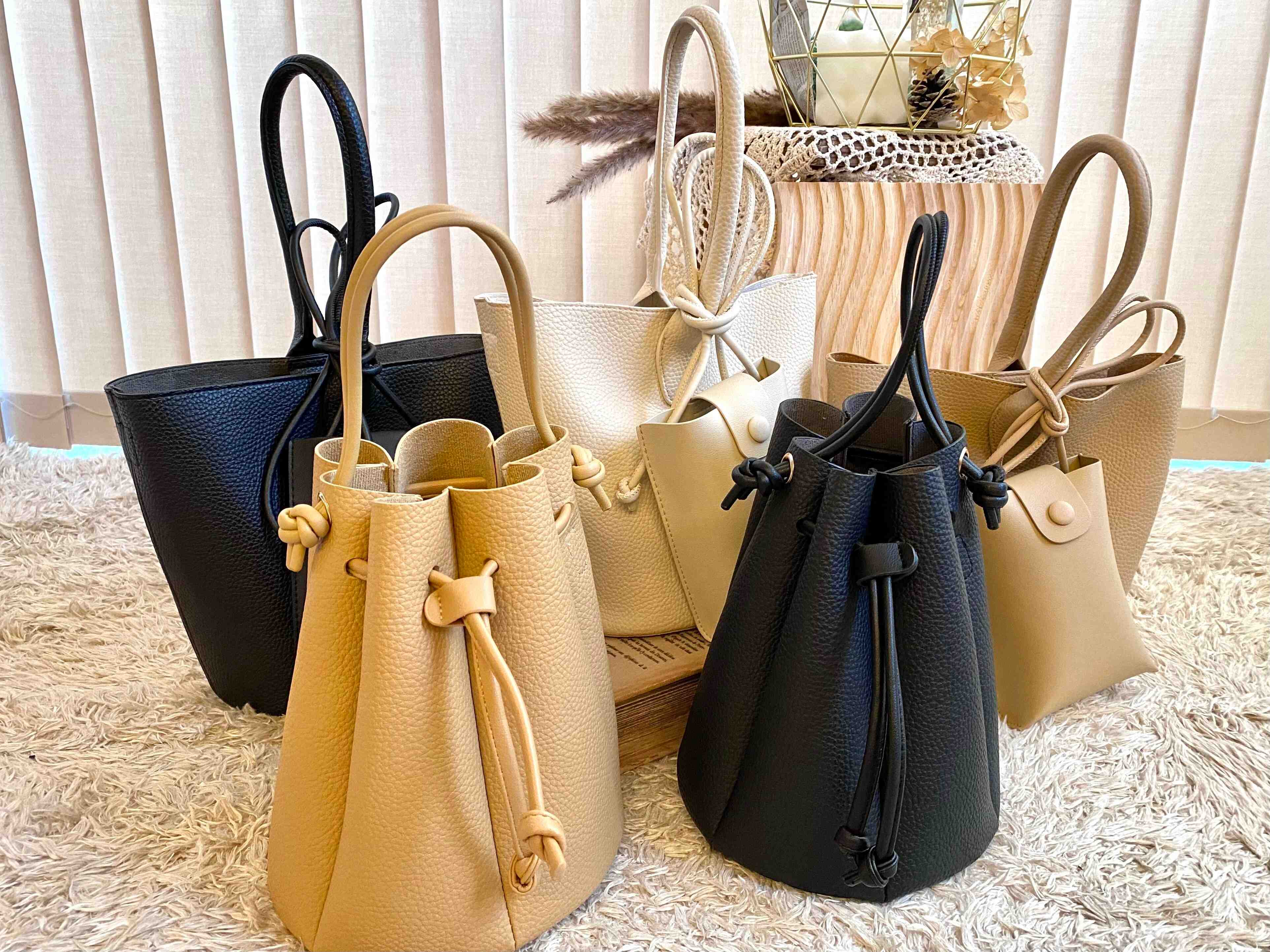 バケツ型の巾着バッグに幅のあるプリーツのデザインが特徴です。ややシボ感のある柔らかなレザー調素材で、ハンドル部分も柔らかな細めのコードが2本使用されています。こちらも金具が最小限しか使用されていないため、高見えでより洗練された雰囲気に仕上がっています。