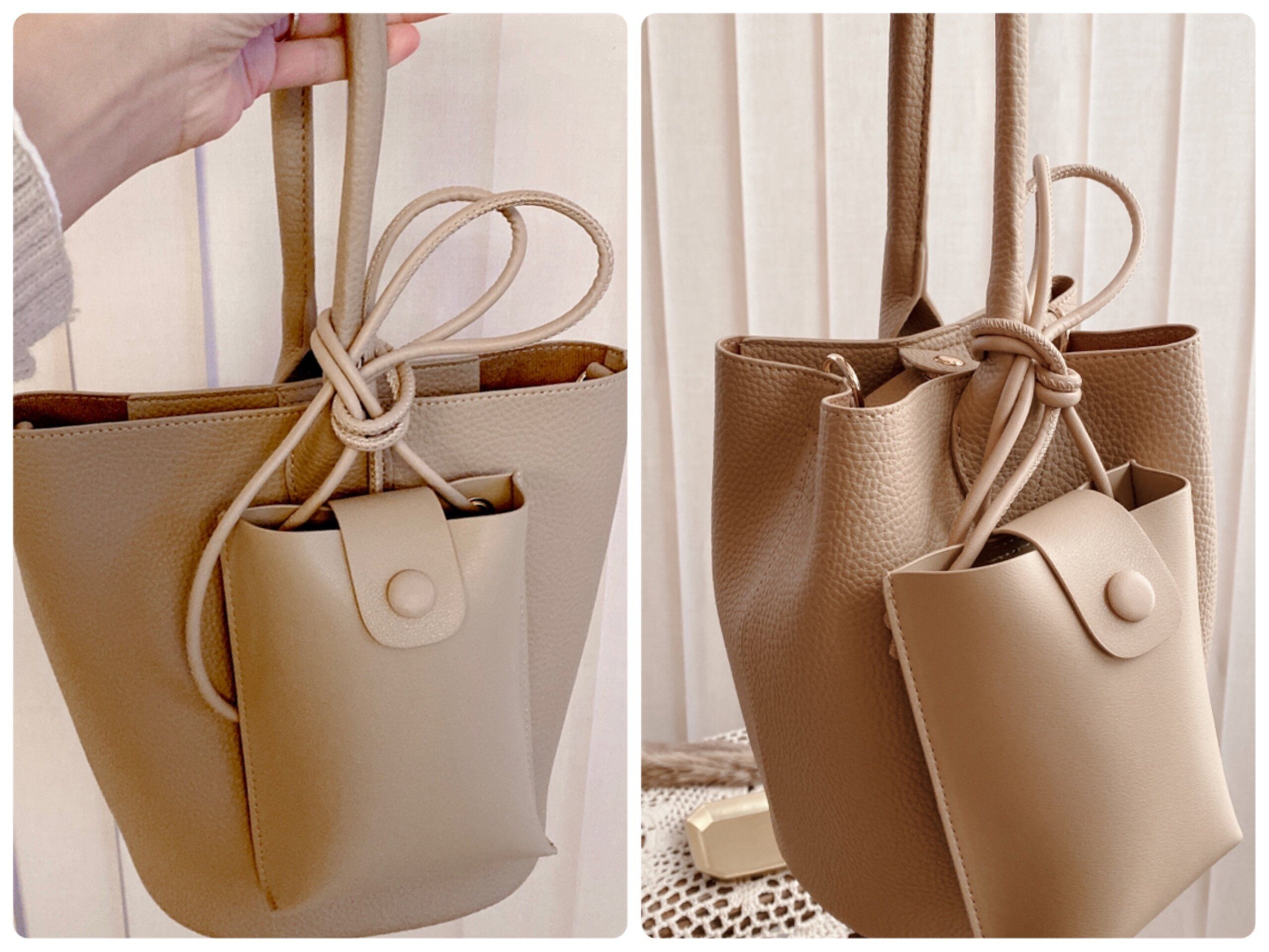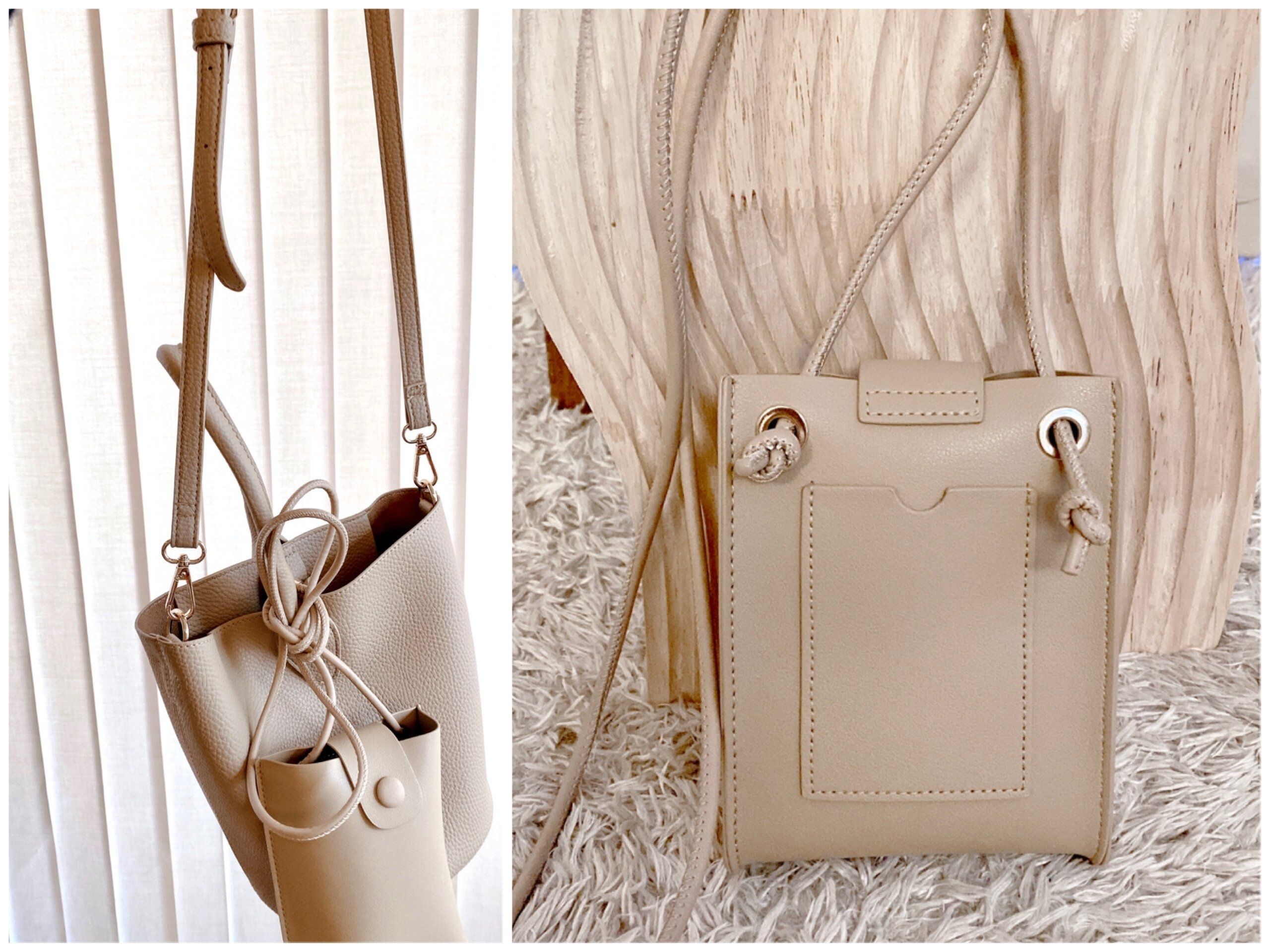 本体バッグはややシボ感のある柔らかなレザー調素材。単体で使えるスマホポシェットはマットな質感でやや張りのある素材です。色味が若干違うのも、オシャレなポイントになっています。