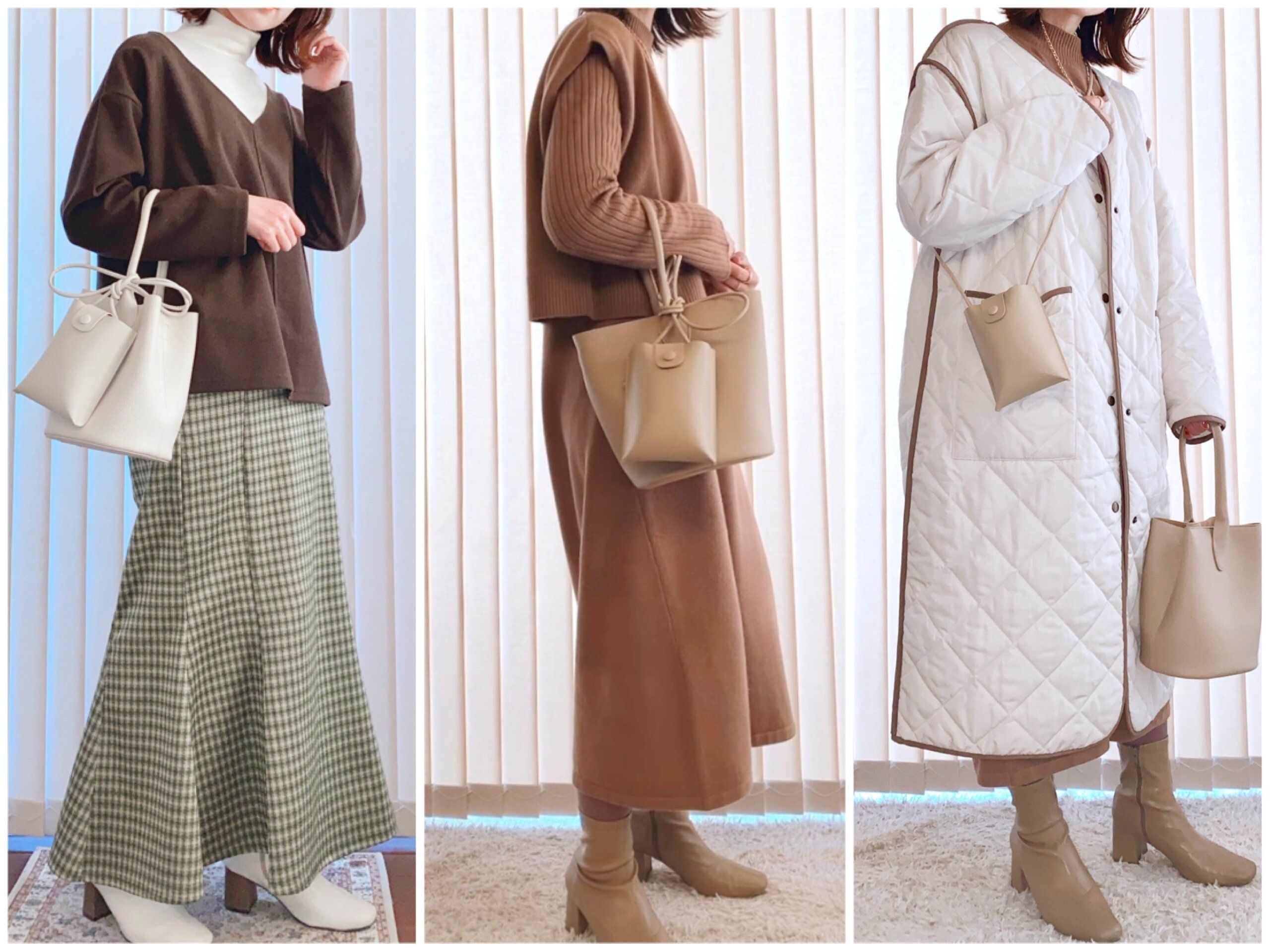 どちらもラテカラーの淡色コーデに合わせてみました。