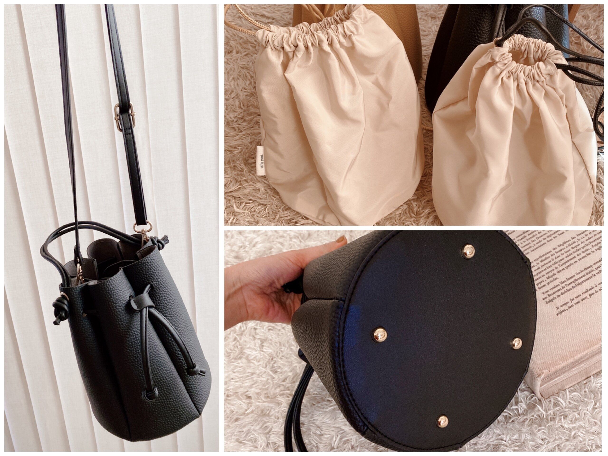 さらに、単体でポーチとしても使える巾着が付いています。バッグと同色のコードが使用されているのもyumi.さんのこだわりポイントです。ポーチに入れることで中身が見えるのを防ぐことも出来ます。もちろんポーチなしで直接荷物を入れることも可能です。