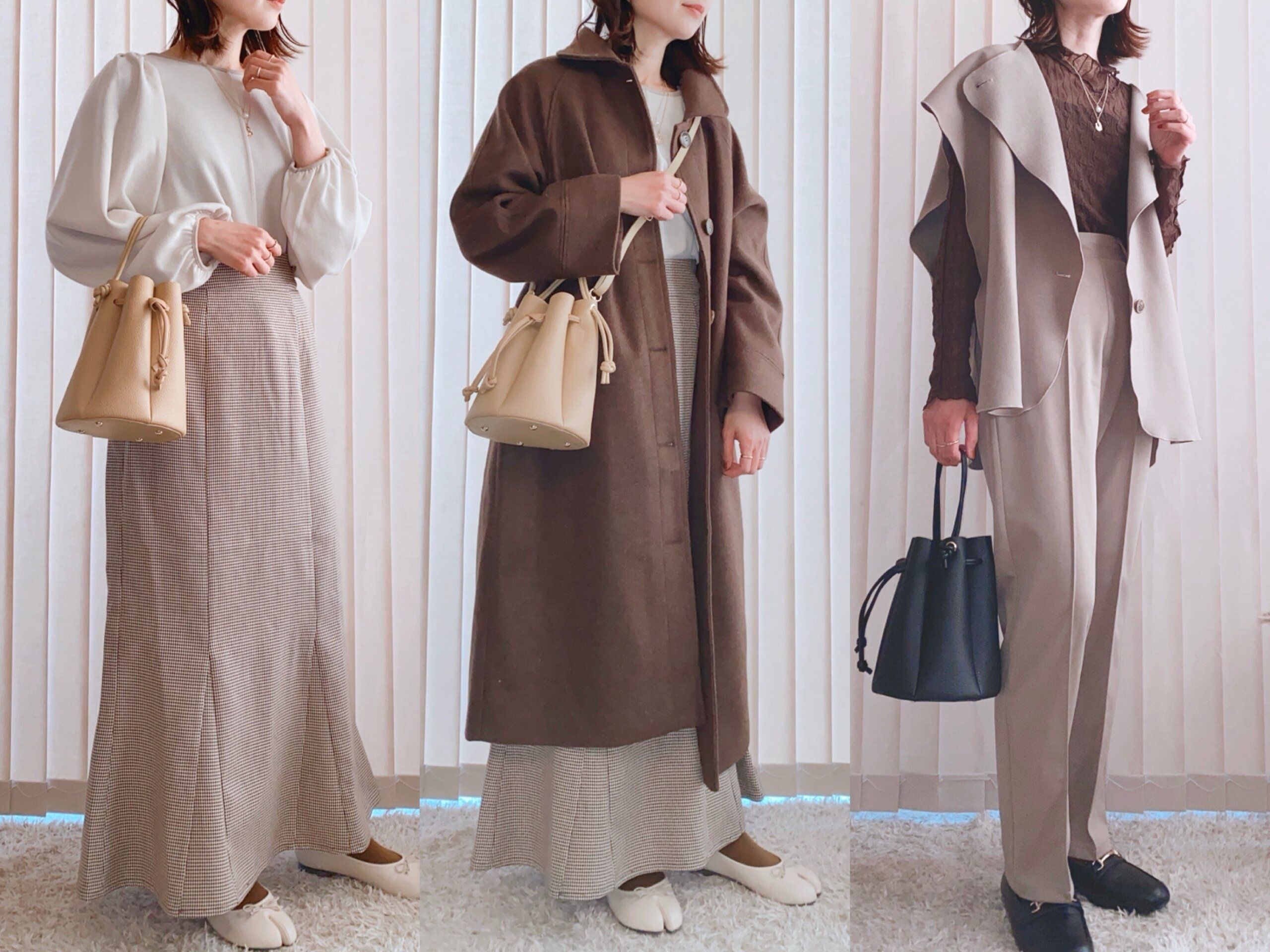 それぞれ淡色コーデに合わせてみました。新色のベージュはミルクティーの様な淡い色合いで特にお気に入りです。