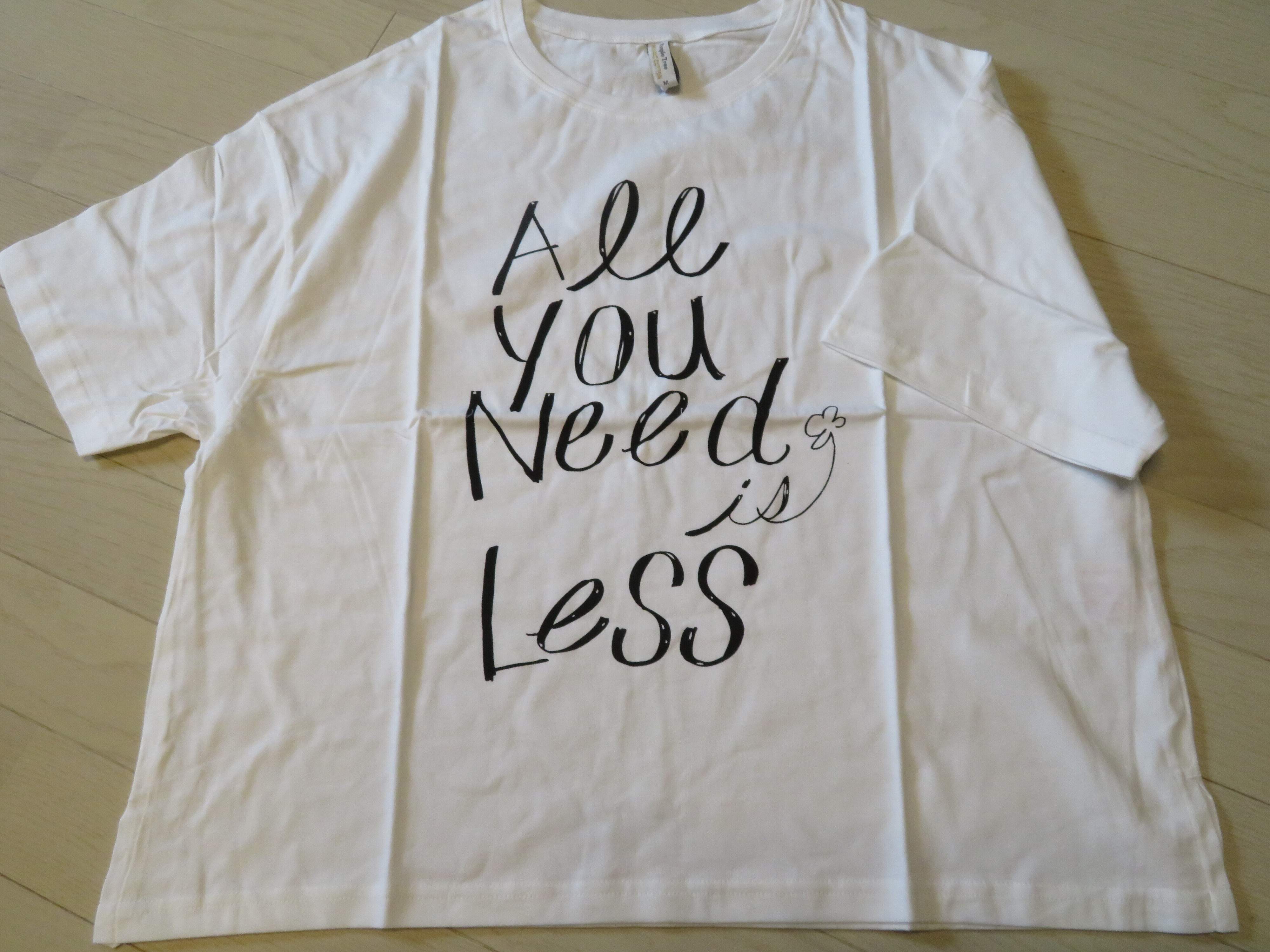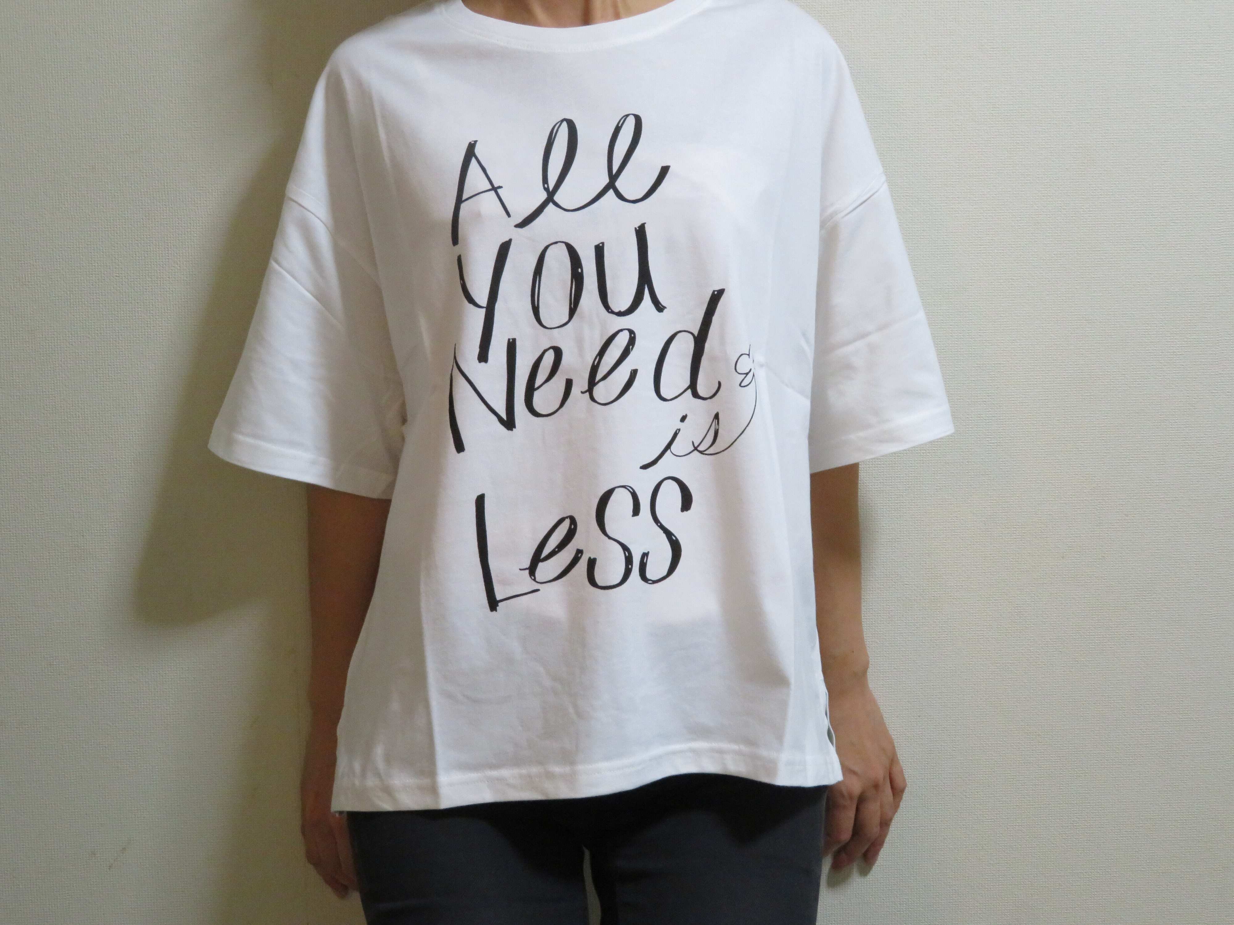 前身頃に大きくプリントされたロゴは、「All You Need is Less」。