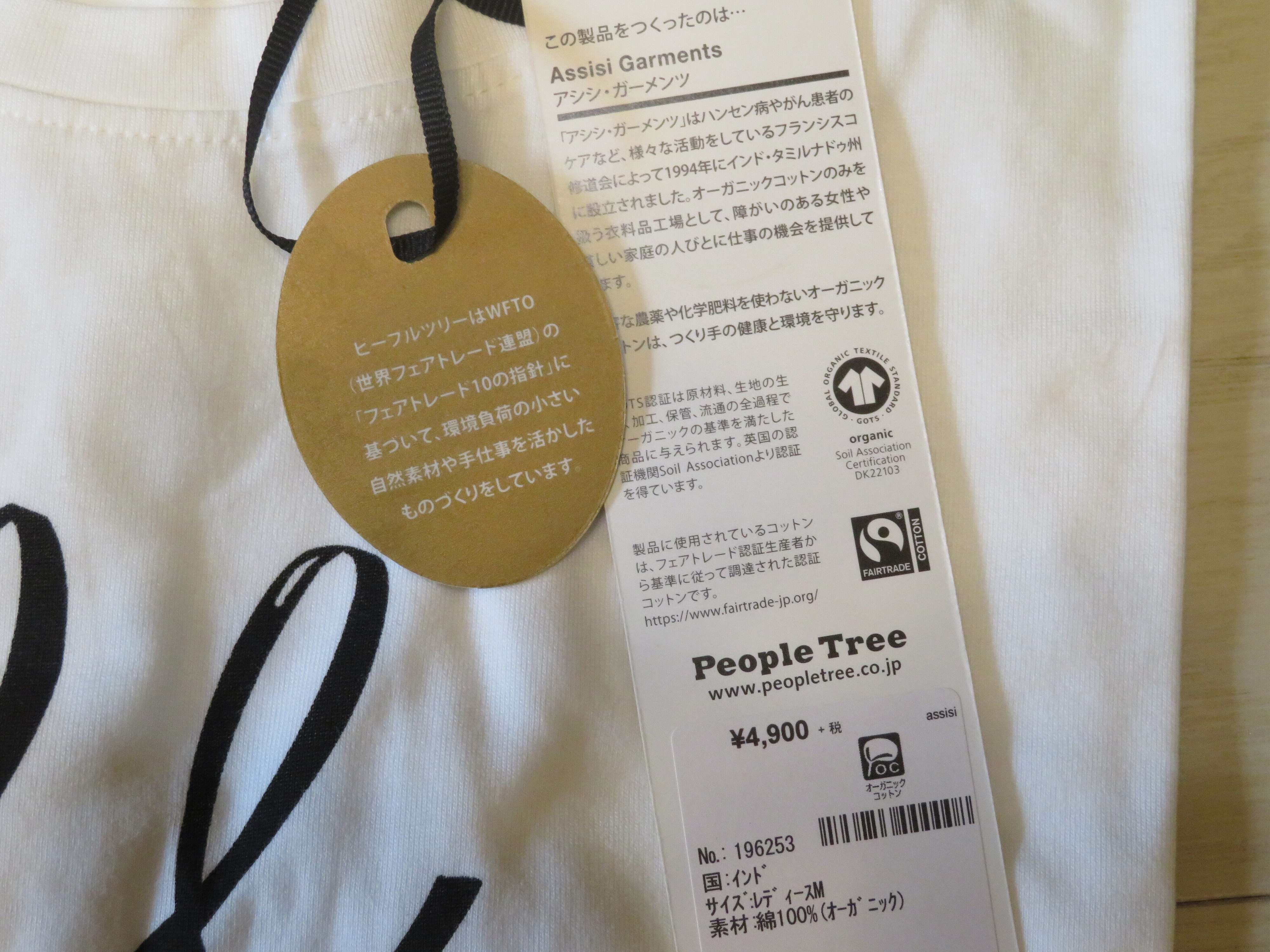 オーガニックコットンを使っていることとフェアトレード商品であることが示されていますね。