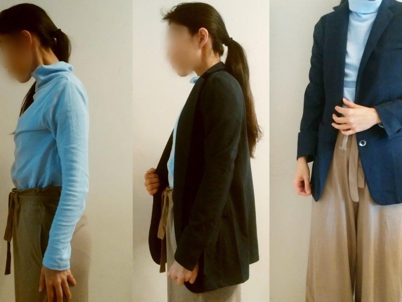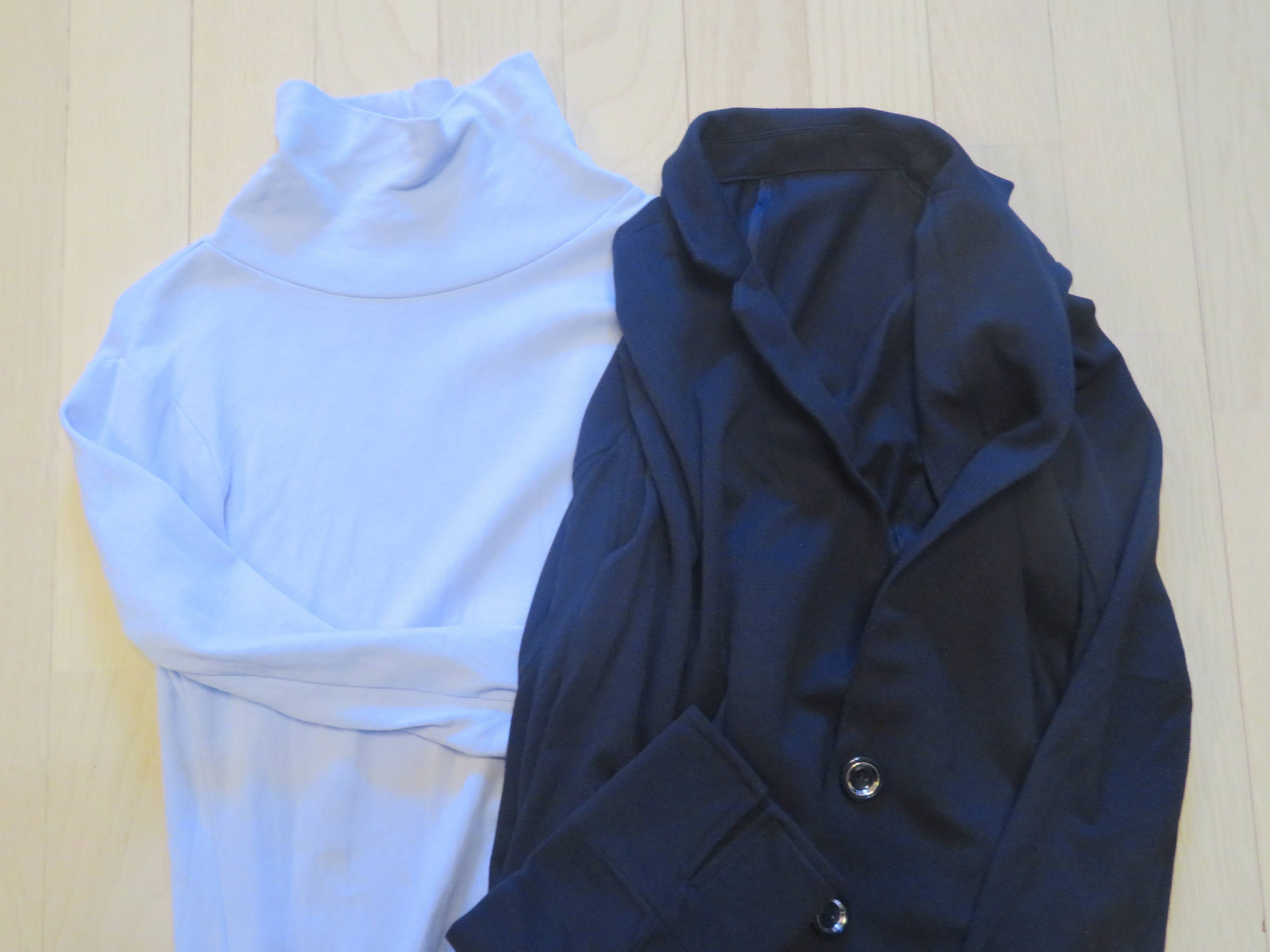 1枚だけで着ると顔がぼやけやすいので、同じブルー系で色の濃いネイビーを合わせる作戦。こちらもセシール、税込3,293円で購入しました。