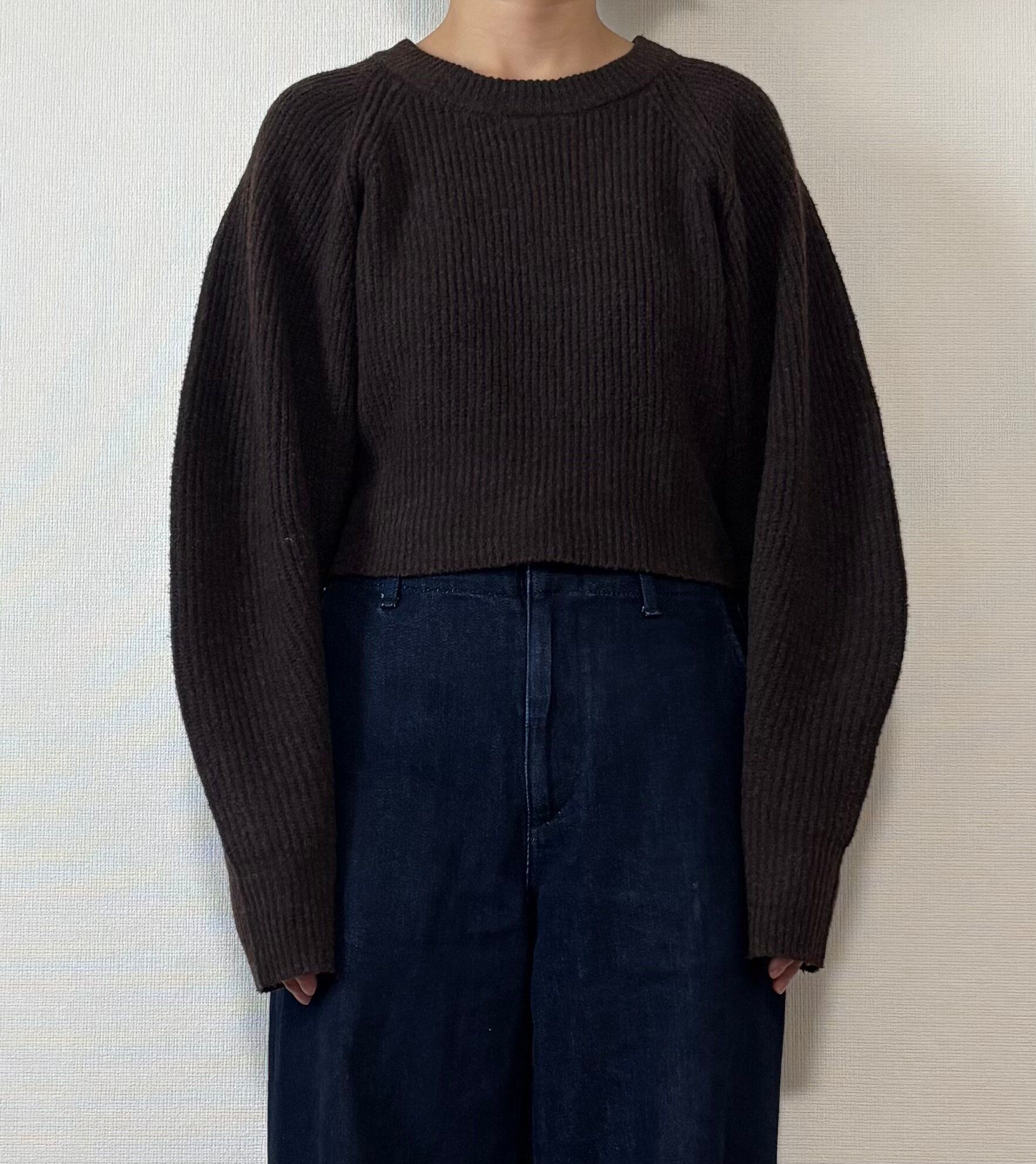 丈が短いのに対し、袖のボリュームと長さがあるので着るだけでスタイルアップする優秀ニットです。