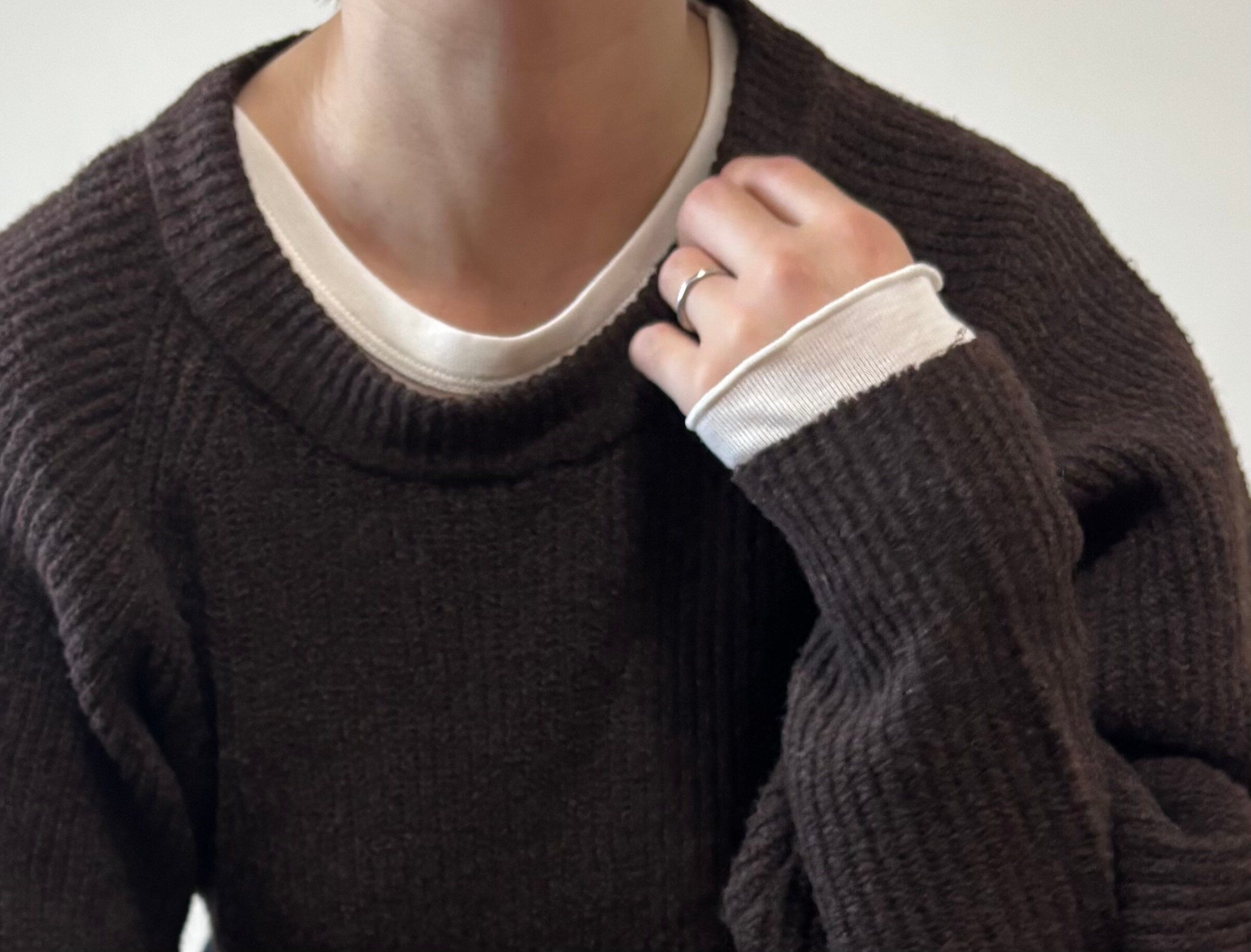 クルーネックにリブの編み地がカジュアルな印象のニットです。