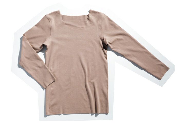 ネックラインや裾が切りっぱなし仕様で、下着の凸凹が浮き出にくく、スッキリ着られる。肌あたりもなめらか